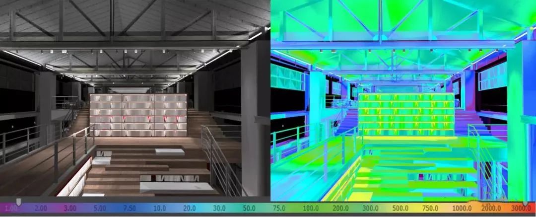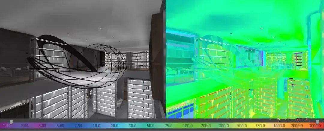 大台阶上方选用大功率轨道射灯保证阅读区的平均照度,二层空间限于层高选择9W轨道射灯提供基础照明。