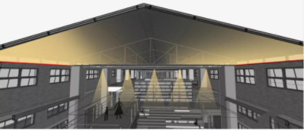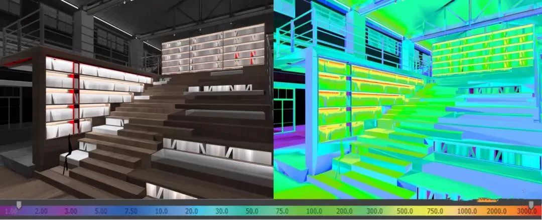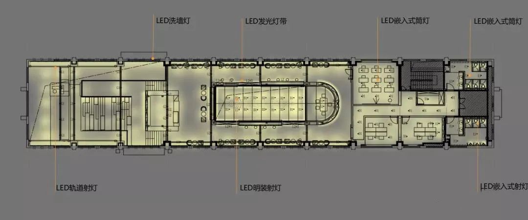 大台阶以轨道射灯提供基础照明,辅以两侧书架及台阶书架内嵌型材灯带提供装饰照明。