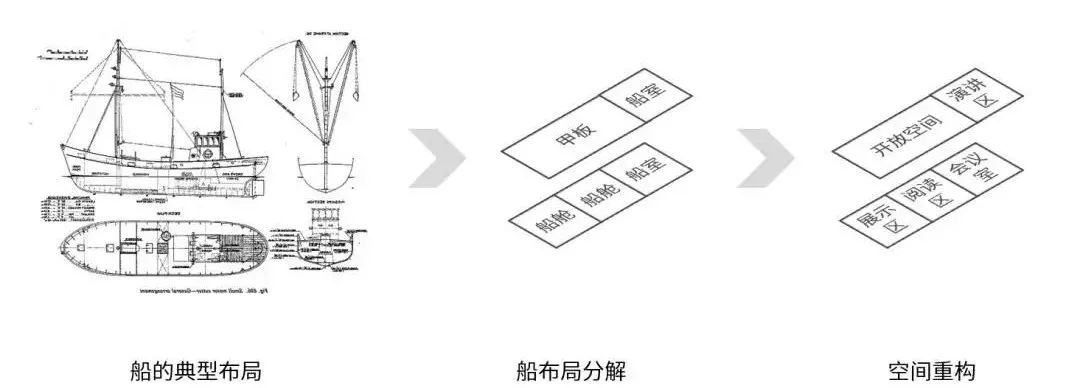 借由传统船舶的空间布局,书局中形成了多元而丰富的空间组合。船首、船仓、船尾,都被抽象化为不同的室内空间,而开放的甲板、半开放的舱室等象征性的船舶空间,也以现代化的方式,在这艘方舟上被重新演绎。