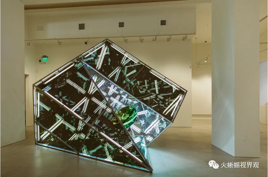 这件作品是Fabrizio Moretti(法布里齐奥·莫雷蒂)设计并制作的,是一个9英尺高的空心立方体,好似迷宫一样,由抛光钢和玻璃制成,切下两个角并倾斜在侧面。它看起来就像一艘发光的宇宙飞船,紧急降落在苏富比位于比佛利山庄的洛杉矶旗舰画廊里。镜子在里面,玻璃是正方形和细长三角形的拼接,上面有荧光管。观众可以进入这个装置,其中产生无限的反射,并将观众包围在一系列重复和虚幻的模式中。因为“Kube”也是由单向反射镜组成,所以外部观察者也可以看到作品内部的反射镜。