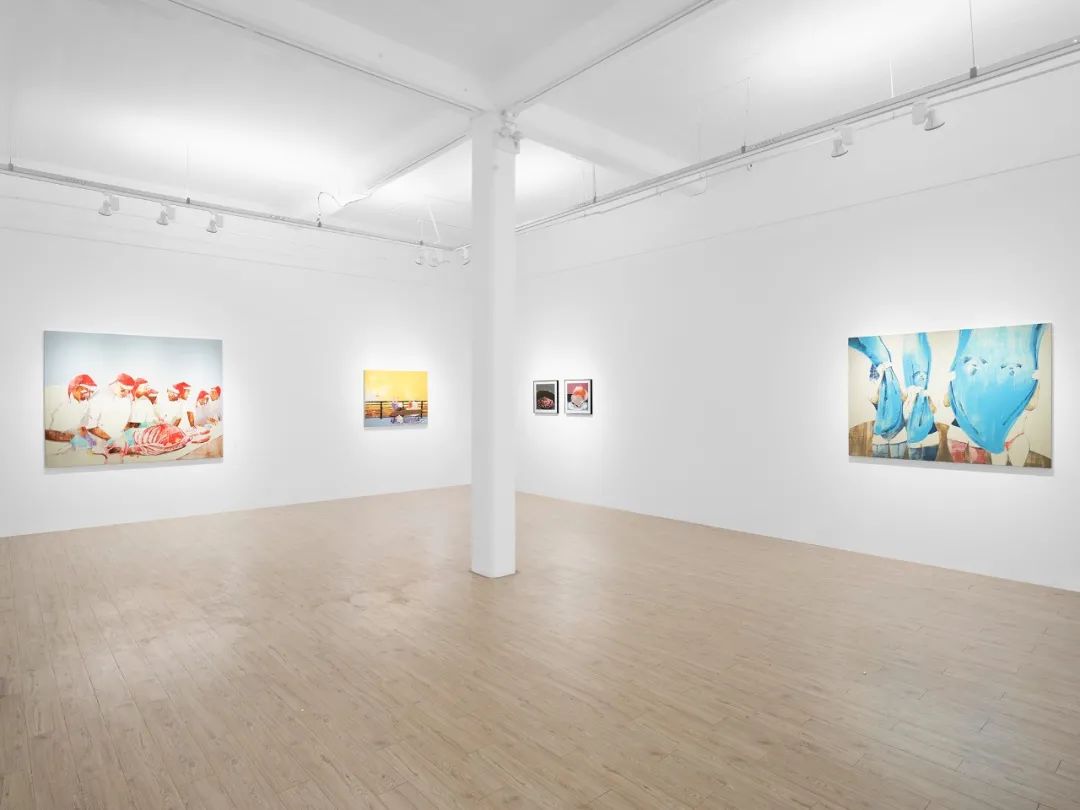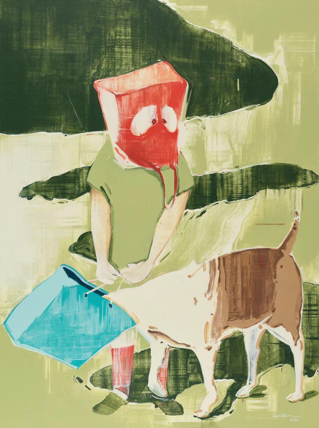 而这些画面中的冲突感在其“多彩且朴素”的大色块描摹中显得更为诙谐与荒诞。有人说觉得看郭典的作品会有像是在看讽刺漫画般的透彻淋漓感,不过讽刺漫画更多的夸张表现力来源于人物面部特征的变形——这些夸张的面部特征同时被赋予人格本质上的意义,例如贪心、忌妒等意涵都可以用特殊相貌来显示,于是挪用了夸张表现形式、合并面相学或是颅相学运用的讽刺漫画,视觉效果便扩大延伸像文字中的双关语一般。但郭典的讽刺意味十足的画作中,人物的面部大多被隐去,只是换上“戏服”,将叙事中的荒诞姿态定格。以日常中容易被人忽略的细微场景展开,讨论当代语境下情感和行为的矛盾,自我与社会的冲突。这些极具张力的笔触和画面,以荒诞派的戏剧方式带给观者极具挑战性的视觉冲击。