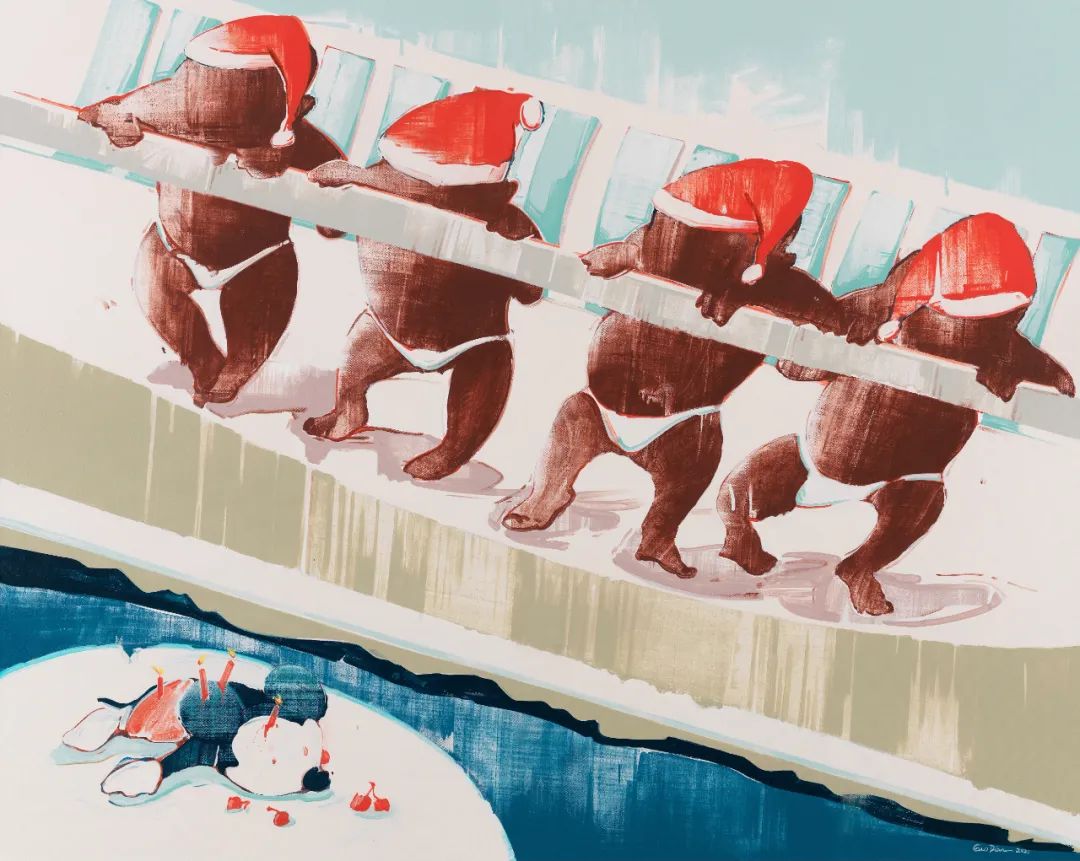 郭典现工作生活于成都和美国拉斯维加斯两地。他近期经常基于他所拍摄的照片或者是在网络上搜索的图片进行油画的创作。通过色域跨度巨大的反差,造成强烈的视觉冲击,直切艺术家关注的叙事主题。一方面而言,郭典的作品并不属于狭义上常定义的“潮流艺术”,但另一方面其作品中所描绘的场景,揭示的问题与戏虐讽刺的态度又是那般站在时代潮流的浪尖,充满反叛的精神。潮流从其语汇学根本而言,是一种快风尚,艺术最大特色之一便是其永远在孕育最新的可能性。如何让其创作的作品当下而永恒,也许从另一个角度回应着弗雷德的“在场性”。