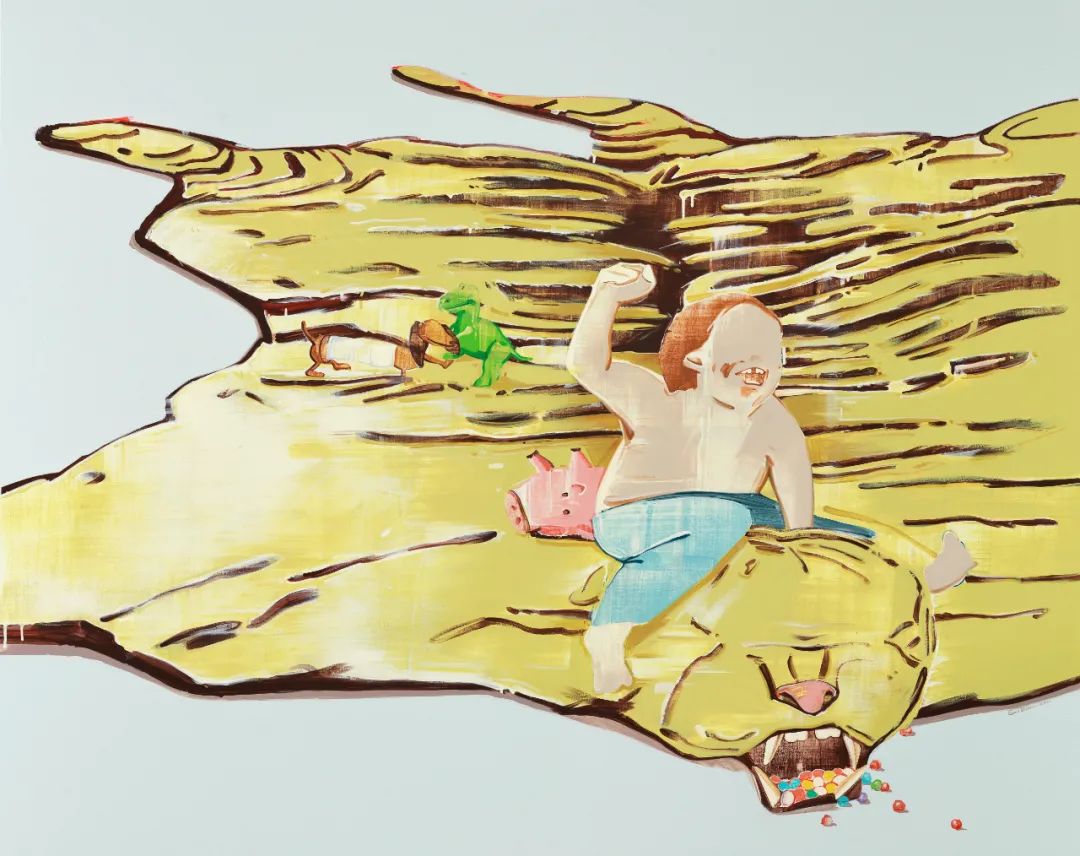 而在“不给糖就捣蛋”这一幕中艺术家试图去探讨更加深刻严肃的议题。胖小孩打虎的构图似是年画,而散落着的诸多视觉元素指向一种童趣。但整个画面却给观者心理上的压抑感,虎皮形成板块地图般图像,而花纹则更似是真实的地理沟壑感。看似的儿童玩具,却呈现冲突之姿,连两个抹去面部主体特征的主角之间——孩子与虎——也以嘴形呈现出某种成王败寇的情绪色彩。