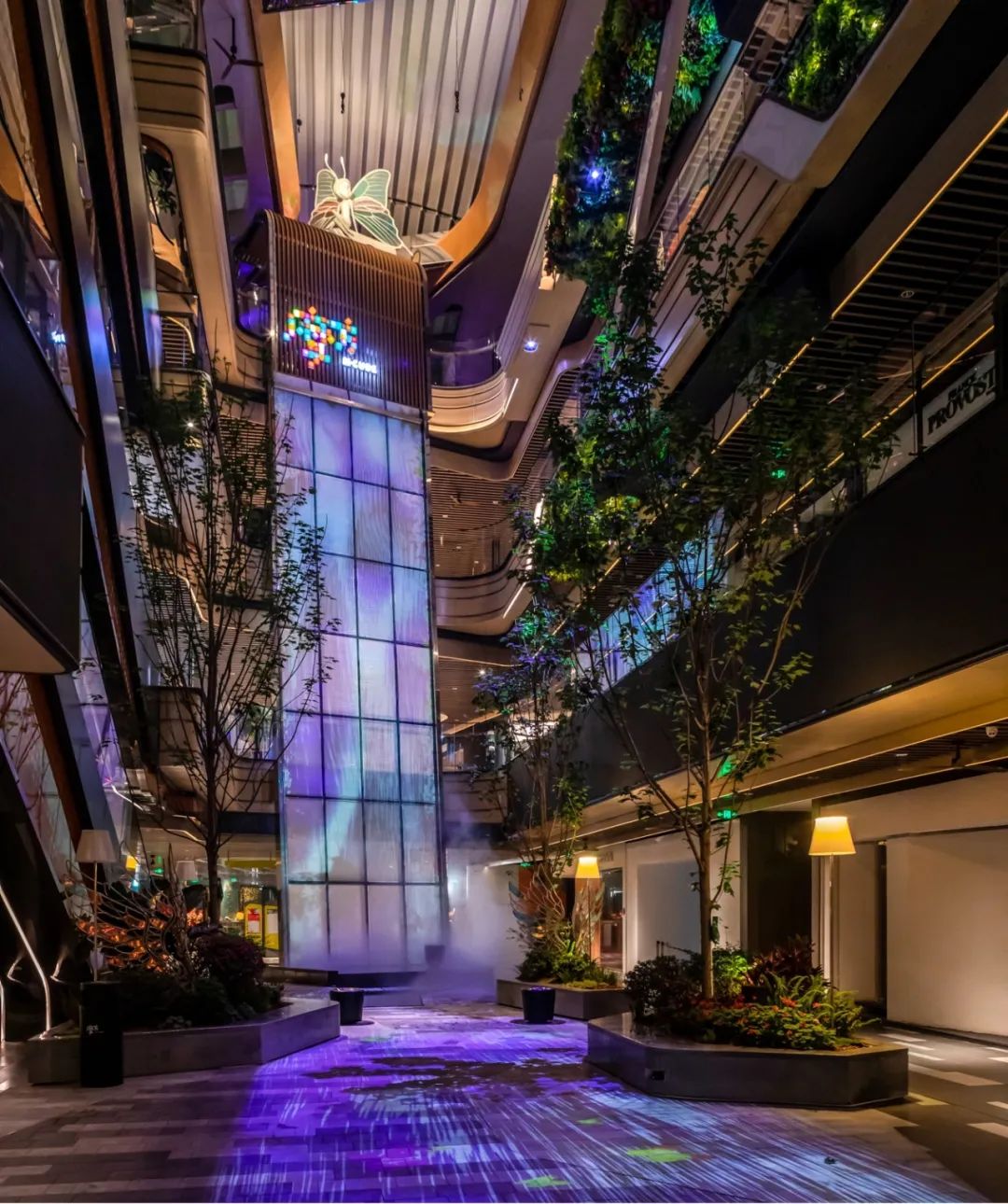 合景·摩方(成都)则精准锁定都市年轻人,着重打造“森系时尚腔调街区”。业态方面,以时尚买手店、精致餐厅为核心,强调“悦己型”消费;空间打造延续合景泰富一贯的“艺述”基因,利用大面积绿植、穿插于中庭的精致水景、室内横跨4层的可投影水景瀑布、可自动开合的玻璃穹顶,突出“自然森系”氛围。