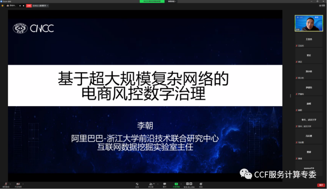 阿里巴巴人工智能治理和可持续发展实验室首席科学家李朝作了题为“基于超大规模复杂网络系统的电商数字化治理”的特邀报告,介绍了复杂电商环境下超大规模复杂网络的推理和计算技术,以实现在多源、异构的超大规模复杂关系网络中对作弊行为进行有效的推理识别。