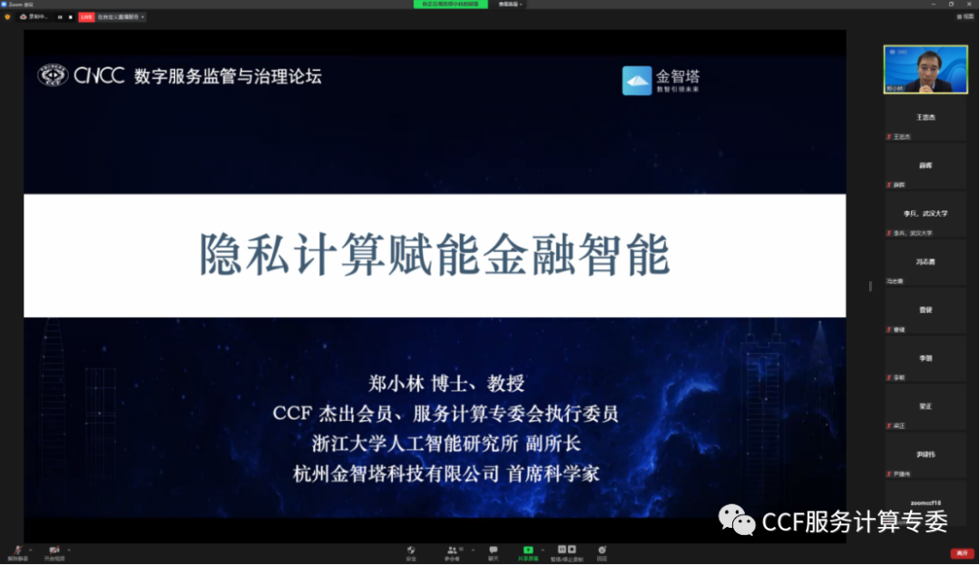 CCF服务算专委会执行委员、浙江大学郑小林教授作了题为“隐私计算赋能金融智能”的Panel观点分享,针对原有的金融数据服务模式面临的挑战,介绍了基于多方安全计算的总体框架,以及在金融大数据智能领域的相关应用。