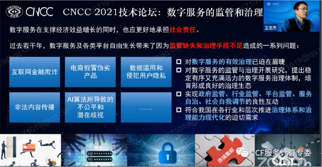 论坛由CCF服务计算专委会副主任、哈尔滨工业大学王忠杰教授主持。在开场介绍中他指出,数字服务以互联网、大数据等为载体,支撑现代服务业各行业供给与消费的高效对接,但因监管缺失和治理手段不足造成了一系列问题,对数字服务的有效治理已迫在眉睫。通过研究,提出稳定有序又充满活力的数字服务治理体制,培育形成良好的治理生态,符合我国在各行业和层次推进治理体系和治理能力现代化的迫切需求。本次论坛探讨如何建立有效的数字服务治理体系,帮助政府和行业监管部门达成精细化的治理能力,提高监管效率,减少监管成本。