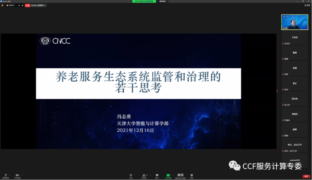 在Panel环节,CCF服务计算专委会副主任、天津大学冯志勇教授作了题为“数字养老服务治理的若干问题”的Panel观点分享,针对老人的多样化的社会需求以及养老服务的特点,从可信养老服务和养老生态出发,探讨了数字养老服务治理的基本问题和解决思路。