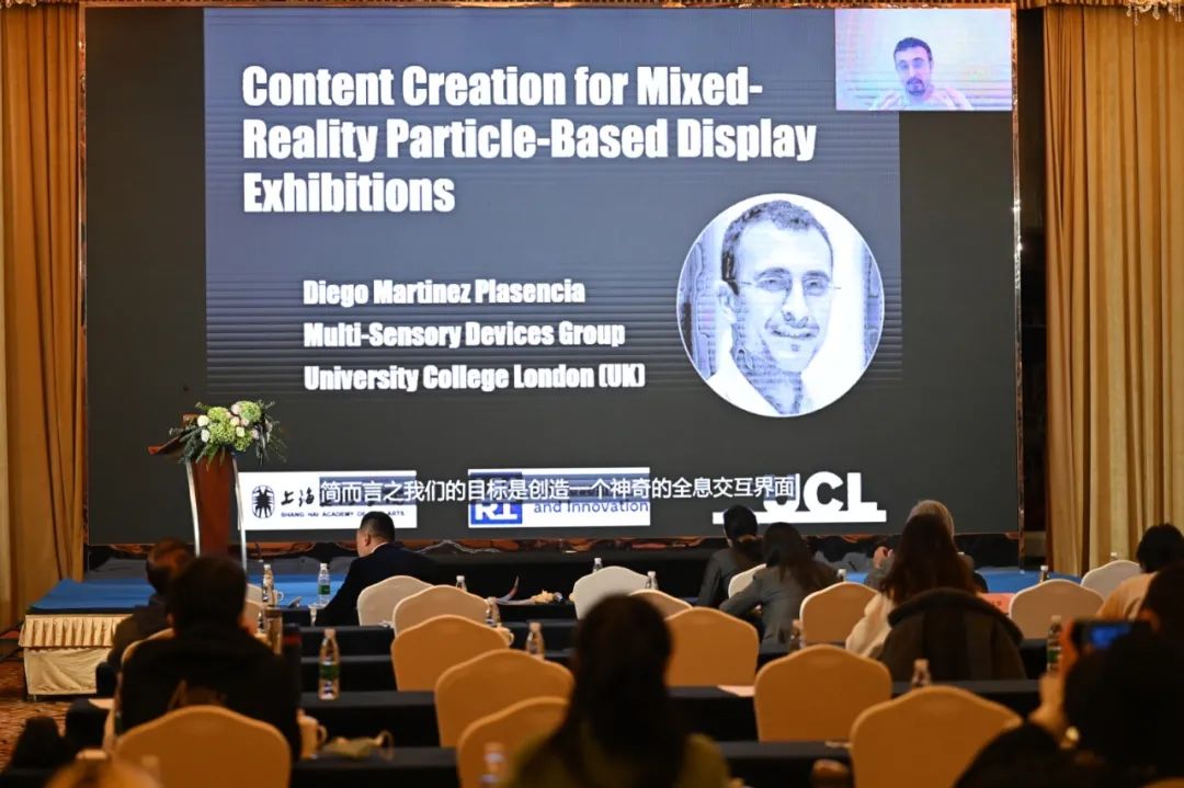 伦敦大学学院教授、英国皇家工程院新型交互系统新兴技术主席 Sriram Subramanian 分享了基于粒子的混合现实制作创意内容,用户通过全息交互页面与之互动,三维影像变成了和真实物体无法区分的物件。要实现这一交互方式需要一套视觉、触觉、和听觉的体积可视化显示设备,以及核心技术——超声波。