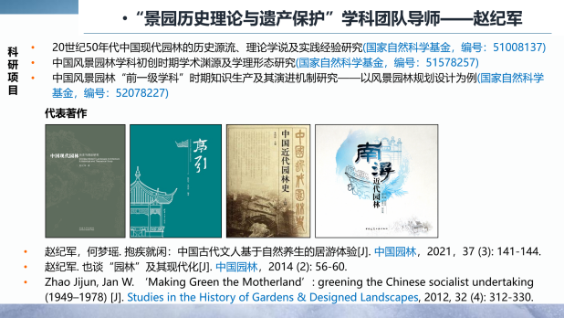 赵纪军教授因腿伤没能出席现场,由主持人殷利华老师代为宣讲。赵纪军教授主要研究方向为中国古代园林、中国近代园林、中国现代园林、风景园林文化以及风景园林学科史,获得3项国家自然科学基金,出版3本专著,多次指导学生获得国内外设计竞赛获奖。