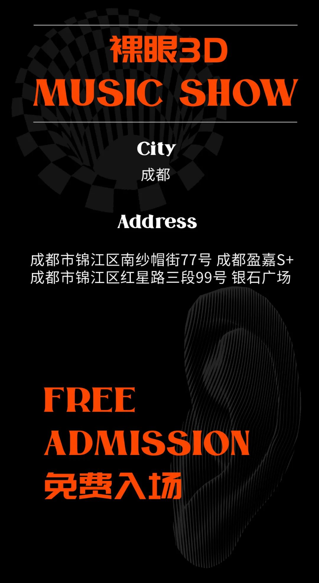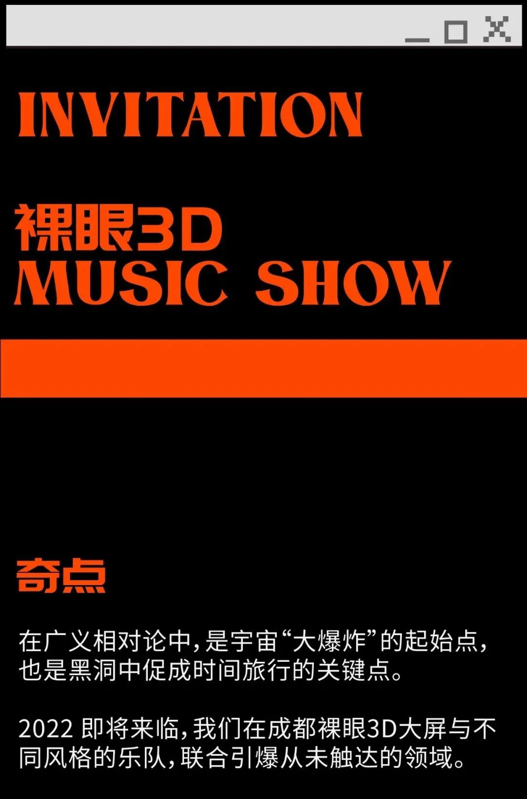 裸眼3D + 音乐 = ?身体腾空,触碰城市上空的音乐奇点。奇点在广义相对论中,是宇宙“大爆炸”的起始点,也是黑洞中促成时间旅行的关键点。2022 即将来临,我们在成都裸眼3D大屏与三支风格迥异的乐队,联合引爆从未触达的领域。裸眼3D + 音乐 = ?身体腾空,触碰城市上空的音乐奇点。