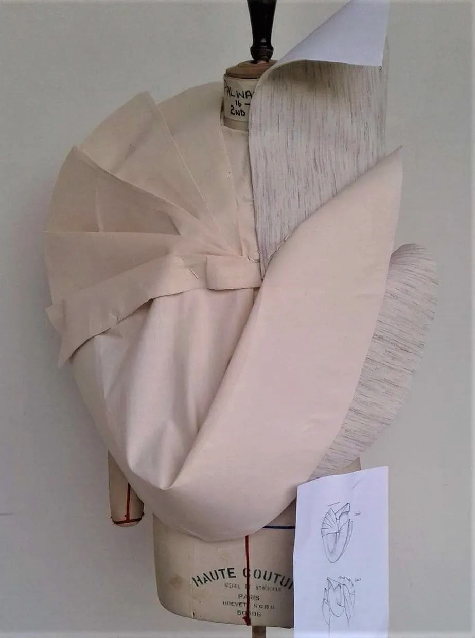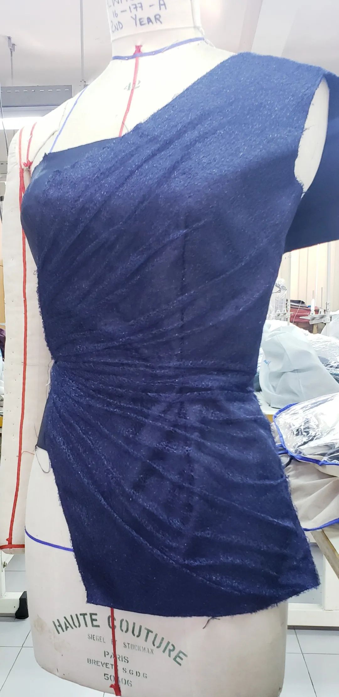 I rely mostly on draping and digital app for my designing. For me draping is a fast, clear, and better way of extracting garments as it helps me in getting a clear view of the dress fittings. I work mostly on customized designs so draping helps in getting the correct position of the design, cut lines, buttons, embroidery etc. Also, it is easy to check style and shape. Sometimes I drape elements that I want to use in a design and cut- paste them using Photoshop to get design developments. For me it is a more convenient way of getting both flowy and straight designs.