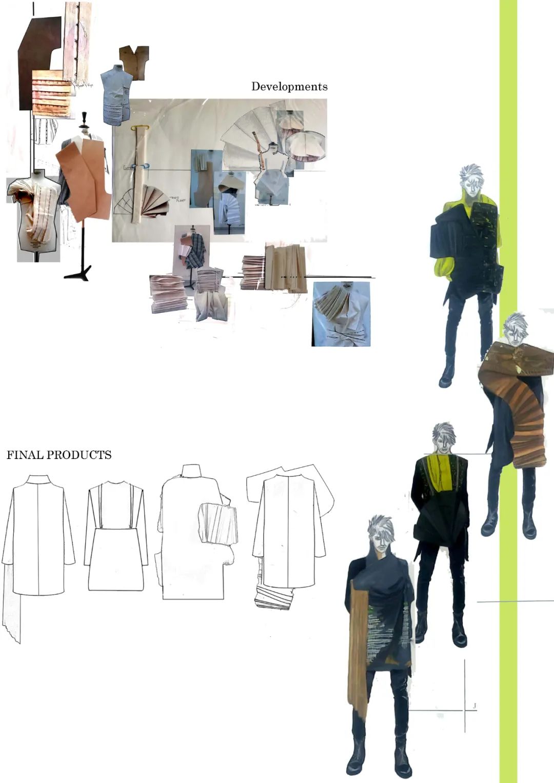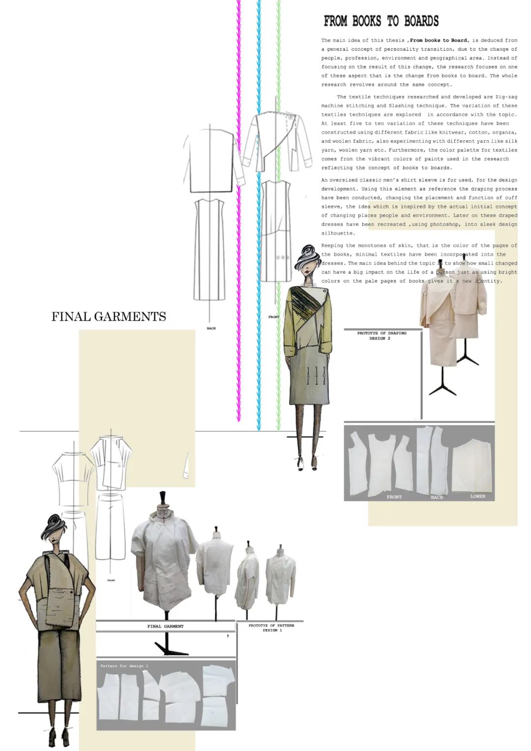 我设计了许多类别,如男装、女装、高级时装和童装。我的小型论文中提到了我最受认可的作品,它的创作是基于我的生活经验。我把它称为 "从书籍到董事会"。它说明了我的生活经历了从文学到时装设计的最大变化。