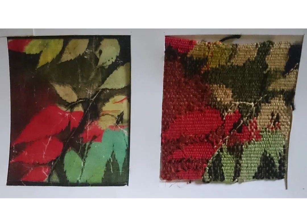 Aboveimage is a piece of loom woven fabric and natural dye printing. The secondimage shows hand woven fabric(right) using different threads that replicates myscreen-printed design(left).
