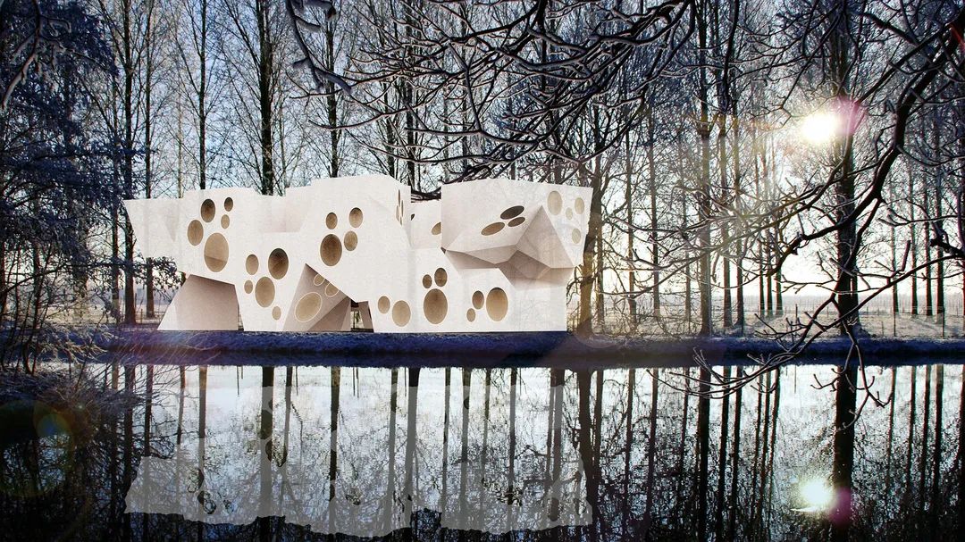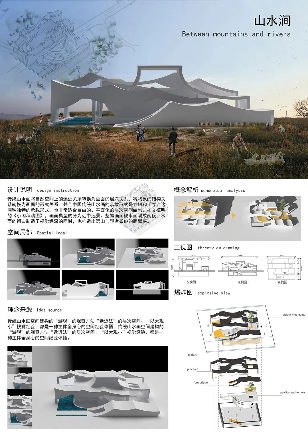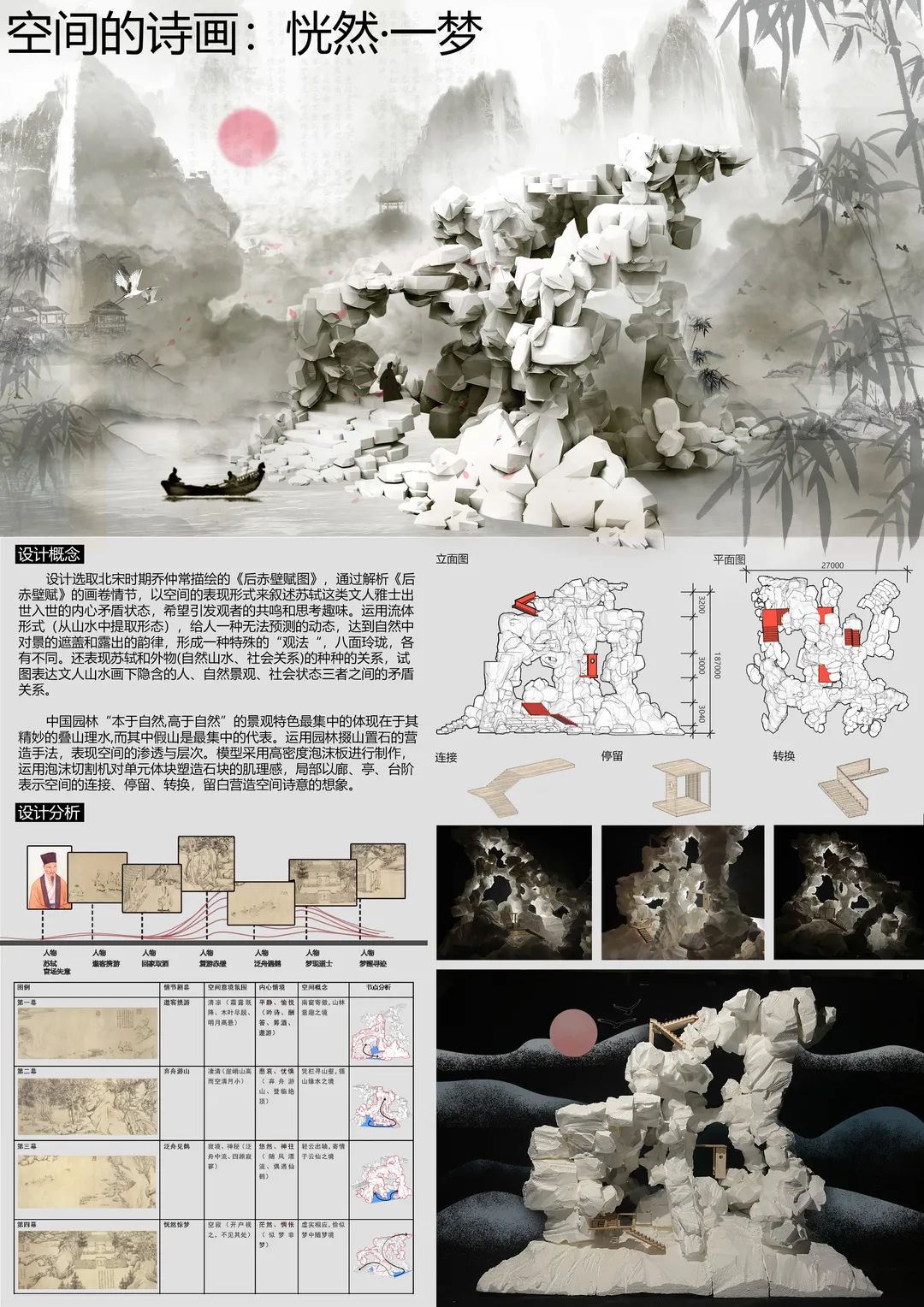 设计选取北宋时期乔仲常描绘的《后赤壁赋图》,通过解析《后赤壁赋》的画卷情节,以空间的表现形式来叙述苏轼这类文人雅士出世入世的内心矛盾状态,希望引发观者的共鸣和思考趣味。运用流体形式(从山水中提取形态),给人一种无法预测的动态,达到自然中对景的遮盖和露出的韵律,形成一种特殊的“观法“,八面玲珑,各有不同。还表现苏轼和外物(自然山水、社会关系)的种种的关系,试图表达文人山水画下隐含的人、自然景观、社会状态三者之间的矛盾关系。中国园林“本于自然,高于自然”的景观特色最集中的体现在于其精妙的叠山理水,而其中假山是最集中的代表。设计作品运用园林掇山置石的营造手法,表现空间的虚实渗透与层次,以留白营造空间诗意的想象。