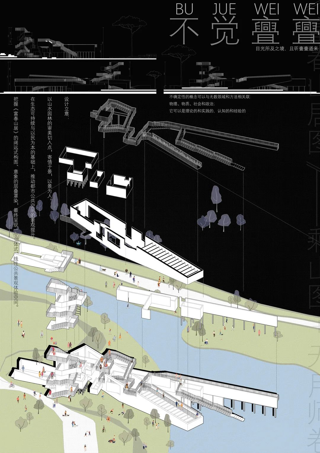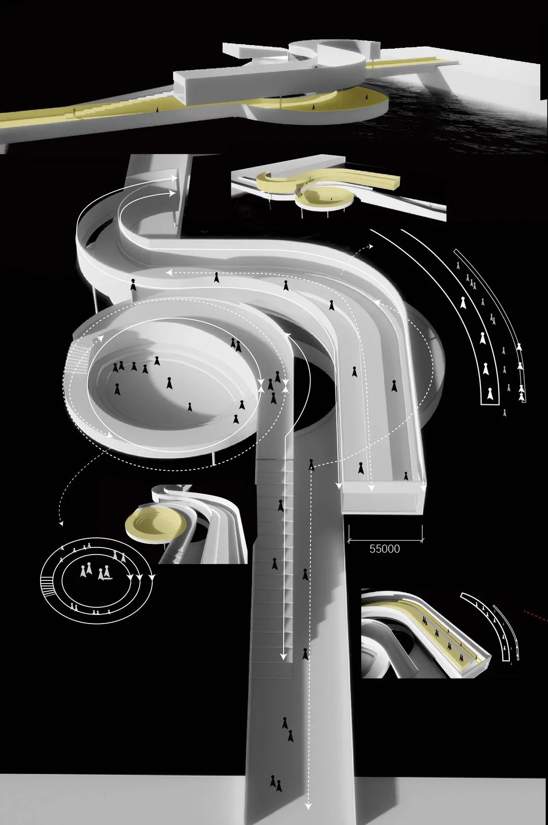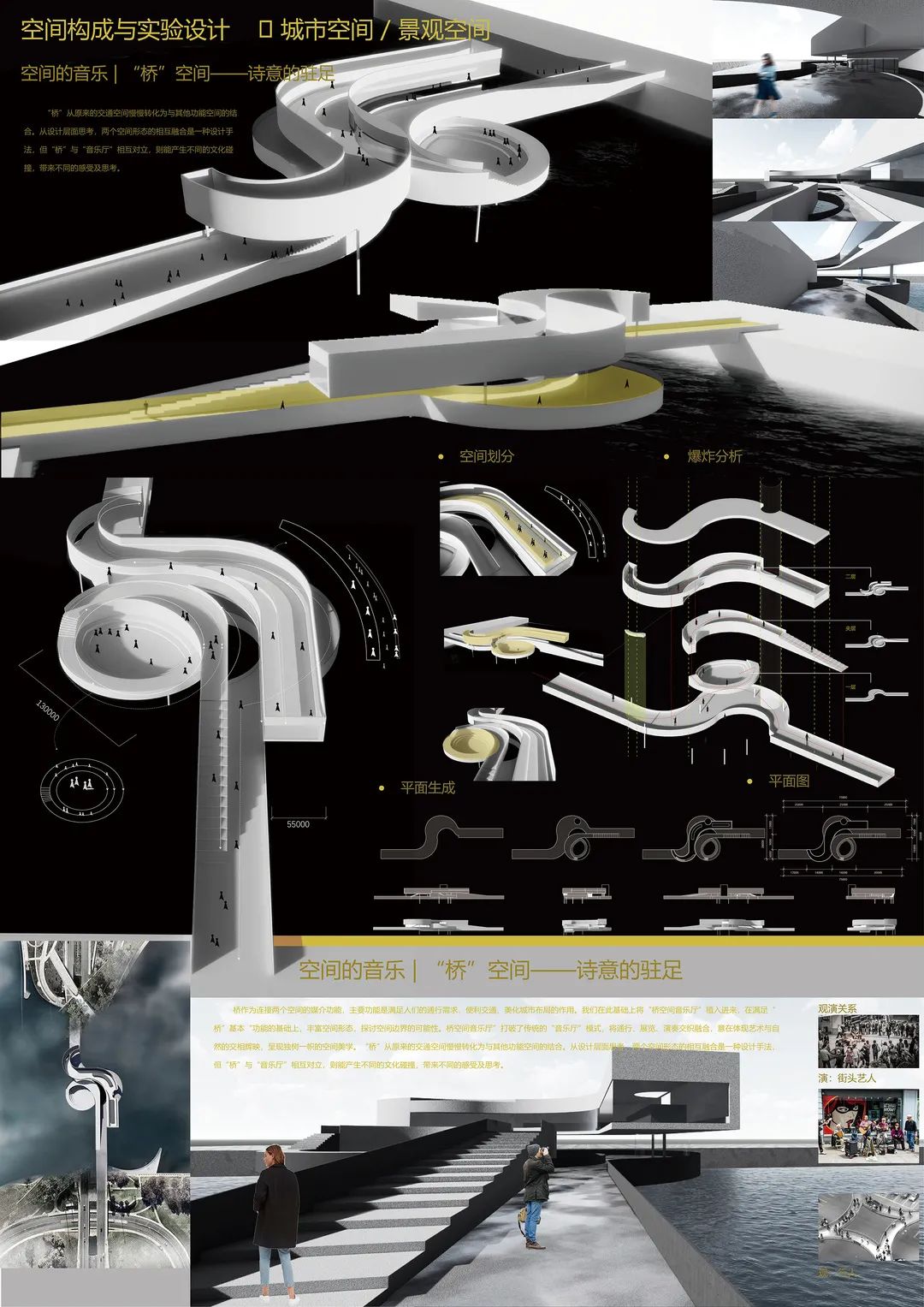 桥作为连接两个空间的媒介功能,主要功能是满足人们的通行需求,便利交通,美化城市布局的作用。我们在此基础上将“桥空间音乐厅”植入进来,在满足“桥”基本功能的基础上,丰富空间形态,探讨空间边界的可能性。桥空间音乐厅打破传统的”音乐厅“模式,将通行、展览、演奏交织融合,意在体现艺术与自然的交相辉映,呈现独树一帜的空间美学。“桥”从原来的交通空间慢慢转化为与其他功能空间的结合。从设计层面思考,两个空间形态的相互融合是一种设计手法,但”桥“与”音乐厅“相互对立,则产生不同的文化碰撞,带来不同感受及思考。