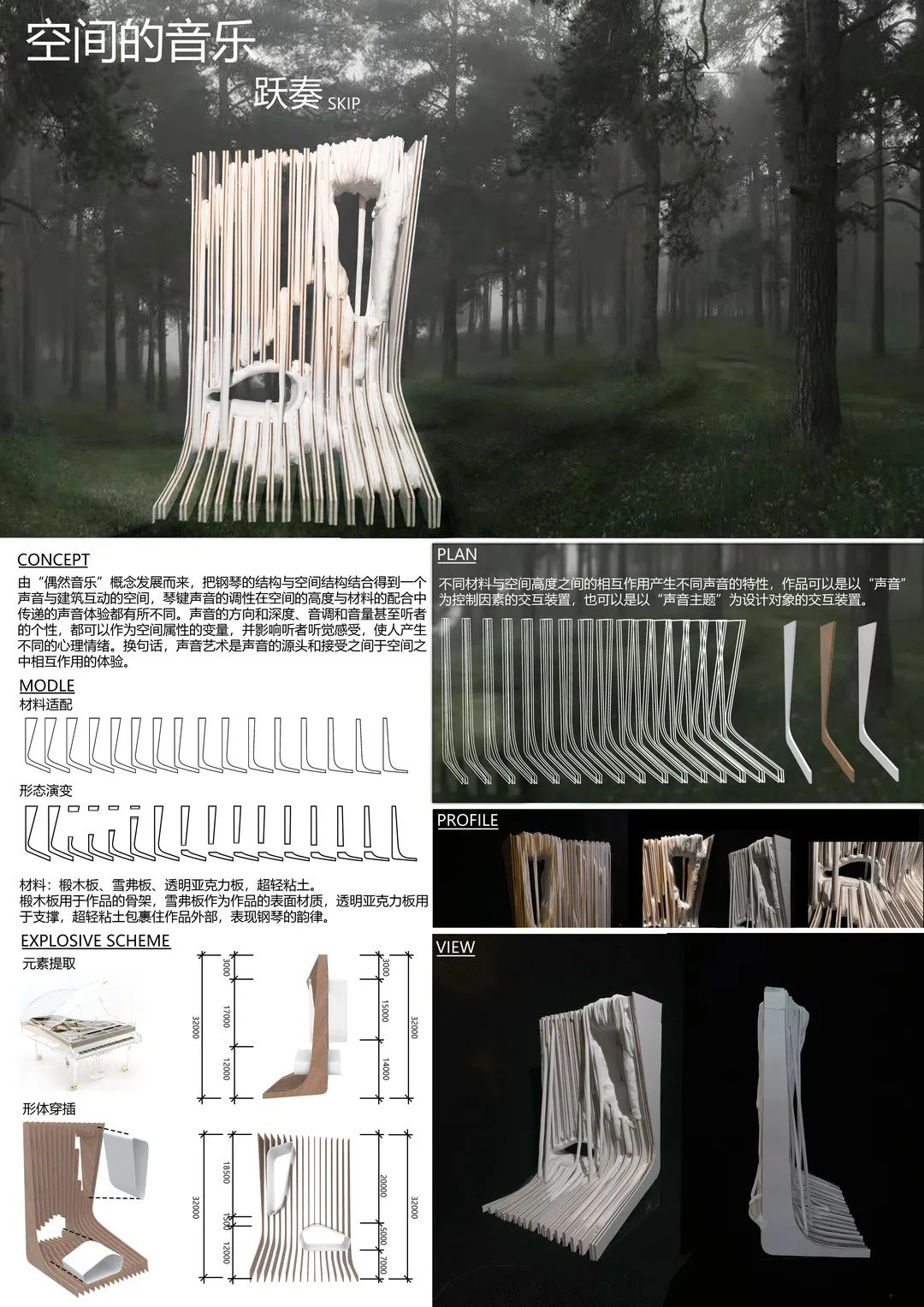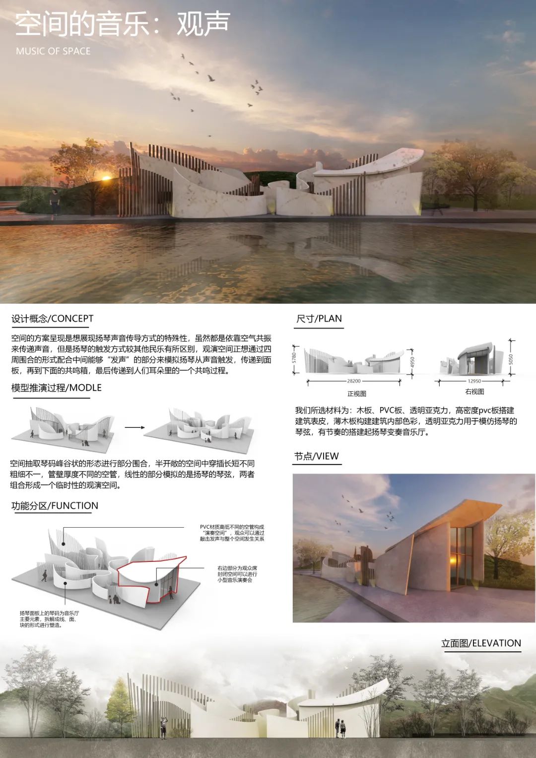 设计是一个临时的音乐观演空间,方案呈现是想展现扬琴声音传导方式的特殊性,虽然都是依靠空气共振来传递声音,但是扬琴的触发方式较其他民乐有所区别,观演空间正想通过四周围合的形式配合中间能够“发声”的部分来模拟扬琴从声音触发,传递到面板,再到下面的共鸣箱,最后传递到人们耳朵里的一个共鸣过程。空间抽取琴码峰谷状的形态进行部分围合,半开敞的空间中穿插长短不同粗细不一,管壁厚度不同的空管,线性的部分模拟的是扬琴的琴弦,两者组合形成一个临时性的观演空间。观众可以敲击中间的管柱发出不同的声音,声音会在的特殊材质的围合处被拦截,保证在一定空间内观众的体验感。