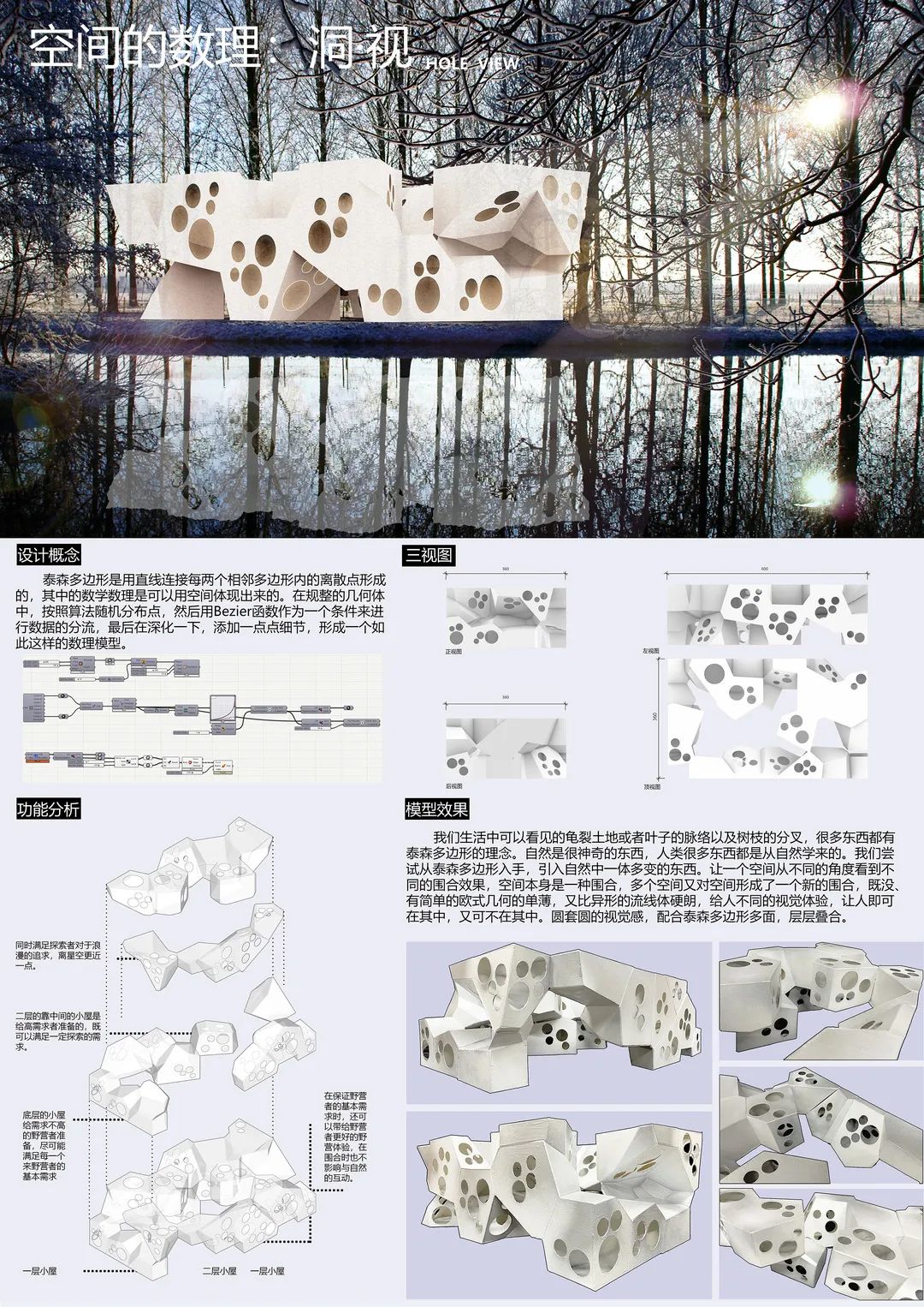 我们生活中可以看见的龟裂土地或者叶子的脉络以及树枝的分叉,很多东西都有泰森多边形的理念。自然是很神奇的东西,人类很多东西都是从自然学来的。我们尝试从泰森多边形入手,引入自然中一体多变的东西。让一个空间从不同的角度看到不同的围合效果,空间本身是一种围合,多个空间又对空间形成了一个新的围合,既没、有简单的欧式几何的单薄,又比异形的流线体硬朗,给人不同的视觉体验,让人即可在其中,又可不在其中。圆套圆的视觉感,配合泰森多边形多面,层层叠合。