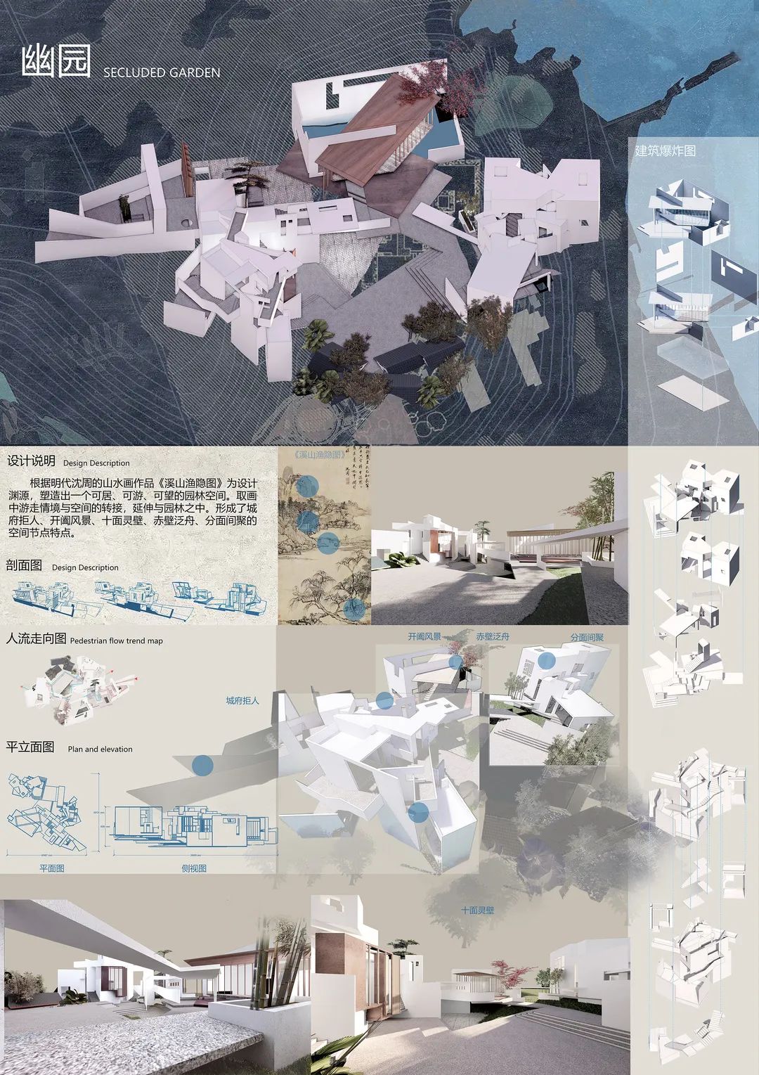 本设计以叠石掇山,各自面向;起居案山,两山夹缝:赤壁泛舟,水廊有叠3个节点为主要节点,在借鉴古人的图示的基础上,以被围蔽、敞开、穿越、叠置和对话的方式得以展开。同时利用连廊连接房间、穿越空间、上跨屋顶,下穿檐下、重返楼台触发空间内的情节。