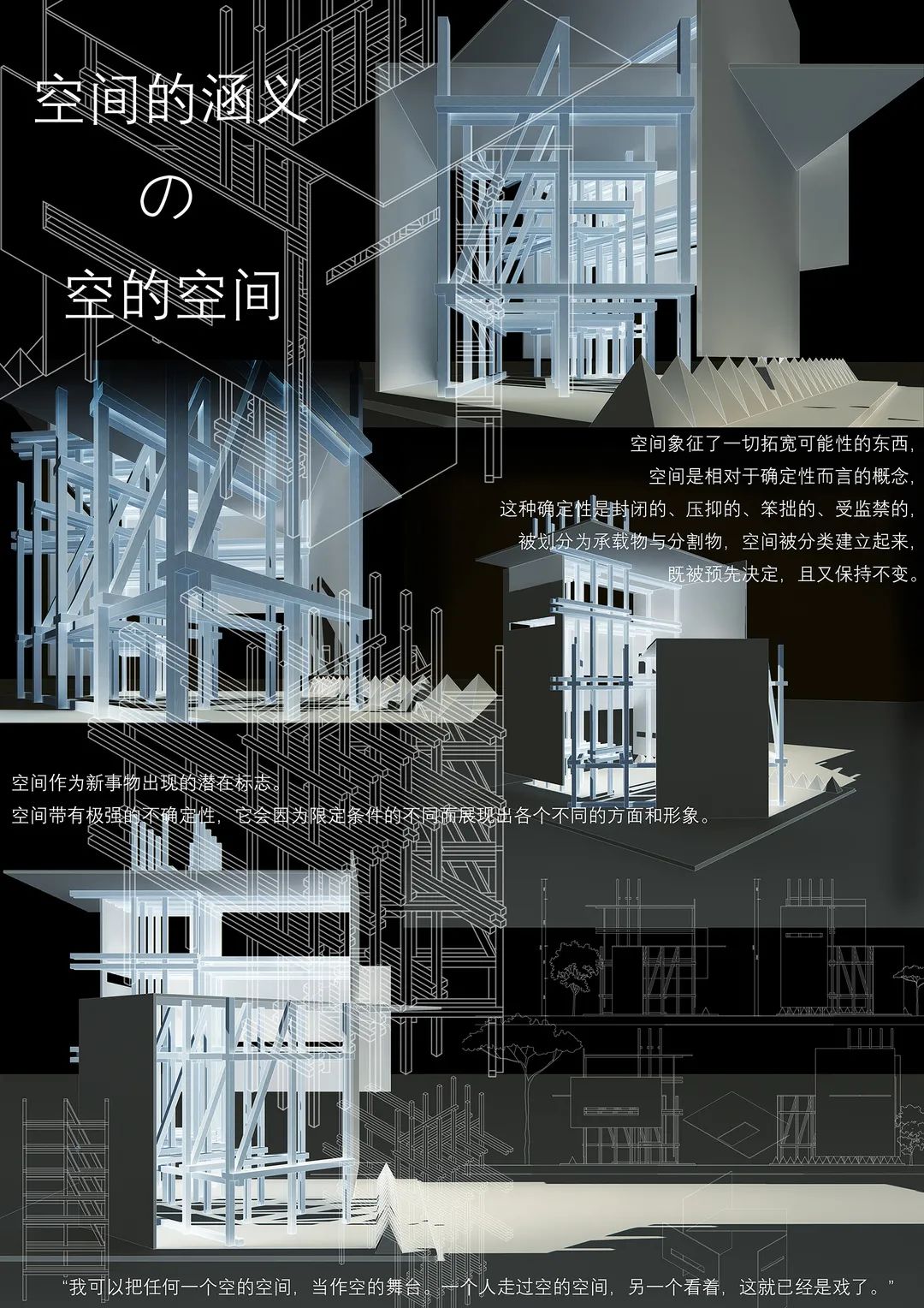 在具体的方案的构思上,意图带着这丰富的空间概念结合具体的空间形态,如作为户外的景观空间、建筑的内部空间、低于地表的地下空间、微观的节点构造等方面进行各种尝试,在进行各种角度的实验后,我们经历了一个完整的概念再认知、文献资料的重新检索与阅读、大师作品的再解读、方案的构思与深化、模型的搭建的学习过程。