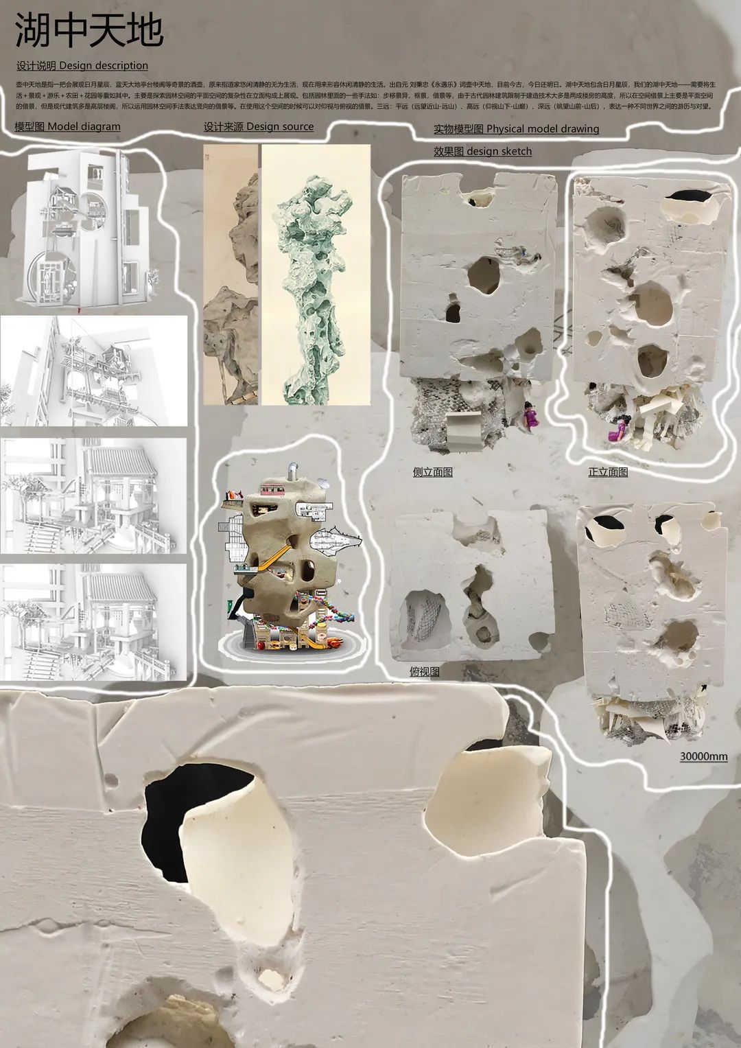 《湖中天地》主要是探索园林空间的平面空间的复杂性在立面构成上展现。包括园林里面的一些手法如:步移景异,框景,借景等,由于古代园林建筑限制于建造技术大多是两成楼房的高度,所以在空间借景上主要是平面空间的借景,但是现代建筑多是高层楼阁,所以运用园林空间手法表达竖向的借景等。在使用这个空间的时候可以对仰视与俯视的借景。壶中天地是指一把会展现日月星辰、蓝天大地亭台楼阁等奇景的酒壶,原来指道家悠闲清静的无为生活,现在用来形容休闲清静的生活。出自元刘秉忠《永遇乐》词壶中天地,目前今古,今日还明日。