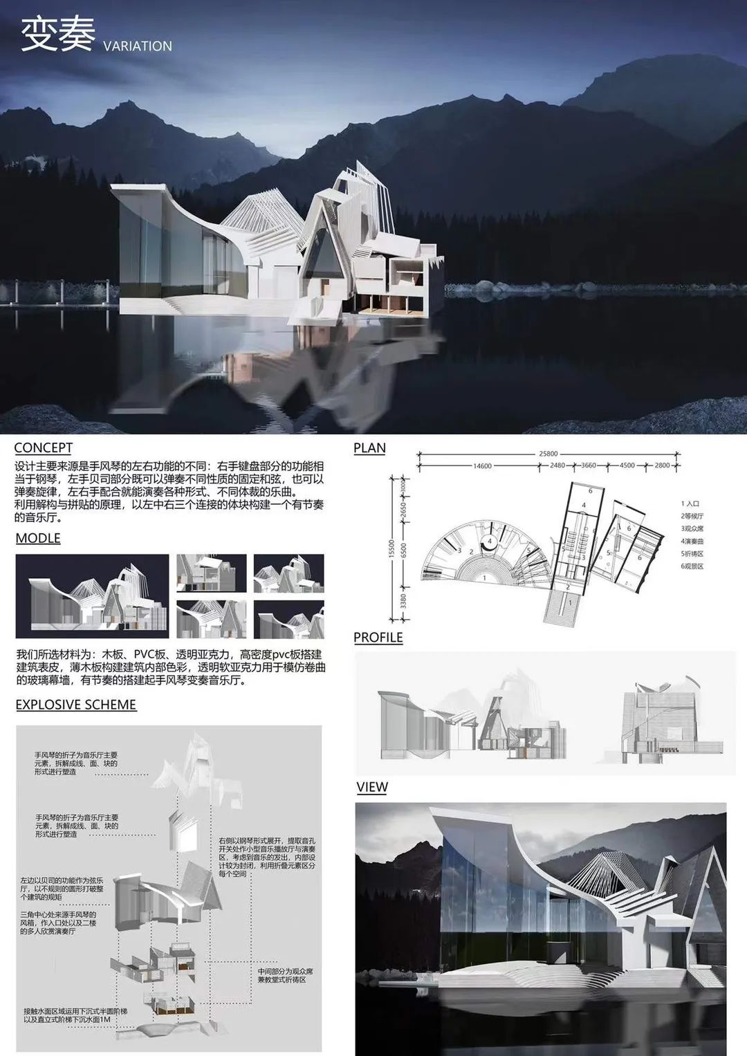 设计主要来源于手风琴的左右功能不同,右手键盘部分的功能相当于钢琴,左手贝司部分既可以弹奏不同性质的固定和弦,也可以弹奏旋律,左右手配合就能演奏各种形式、不同体裁的乐曲。利用解构与拼贴的原理,以左中右三个连接的体块构建一个有节奏的音乐厅。