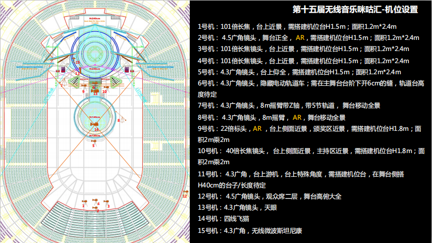 现场采用了d&b audiotechnik扩声系统,为满足艺人演出需求,本次音响系统中使用了大量无线话筒和无线耳返,采用了Shure 无线管理软件Wireless Workbench 6 (简称WWB6)扫描现场无线电环境,计算适合现场无线话筒、无线耳返使用的无线频率,极大程度避免了无线话筒、耳返无线频率干扰、串频等问题。现场共使用3张DiGiCo调音台,其中FOH使用1张DiGiCo SD7调音台,Monitor使用2张DiGiCo SD5,一张提供给驻场的调音师使用,一张提供艺人自带的调音师使用。同时这两张SD5控台共享接口箱信号,减少音分系统带来的音质损失。今年的咪咕汇无论是在策划期还是执行期,时间安排上都非常紧张,整个策划和执行期几乎同时进行,仅仅用了40天。40天的工作考验,让我们再一次看到整个制作团队的高水准和默契的配合。由于疫情防控,晚会从带观众,到不带观众直播,到最后不直播纯录制,导演组经历了很多的调整,除了日程上的调整较大以外,周杰伦的表演也变为了四地的沟通连线制作。现场整个录制过程超过18个小时,整体待机不停歇。由于现场没有观众,制作团队也做了精心的设计,在观众席摆放了超过4000个灯球,根据秀的设计在灯球上做出了HAPPY、G.E.M.邓紫棋等字样,尽管播出有不尽完美的地方,却依然以致敬舞台划下了句号。