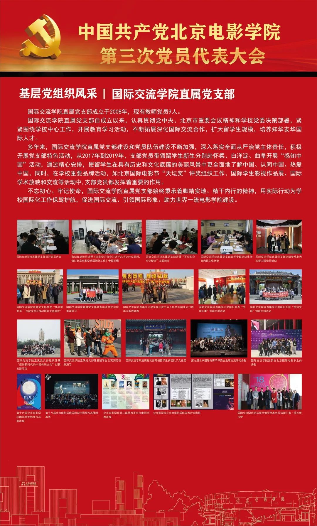 多年来,国际交流学院直属党支部建设和党员队伍建设不断加强,深入落实全面从严治党主体责任,积极开展党支部特色活动,从2017年到2019年,支部党员带领留学生新生分别赴怀柔、白洋淀、曲阜开展“感知中国”活动,通过精心安排,使留学生在具有历史和文化底蕴的美丽风景中更全面地了解中国、认同中国、热爱中国。同时,在学校重要品牌活动,如北京国际电影节“天坛奖”评奖组织工作、国际学生影视作品展、国际学术放映和交流等活动中,支部党员都发挥着重要的作用。