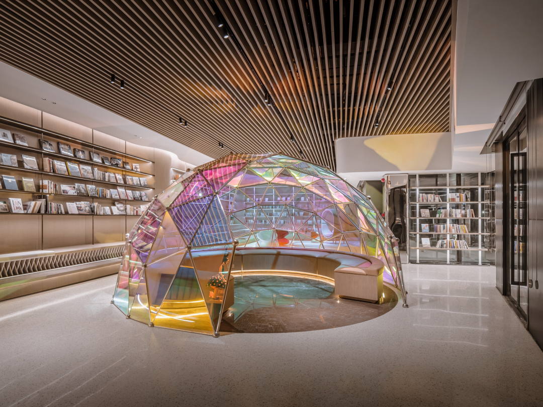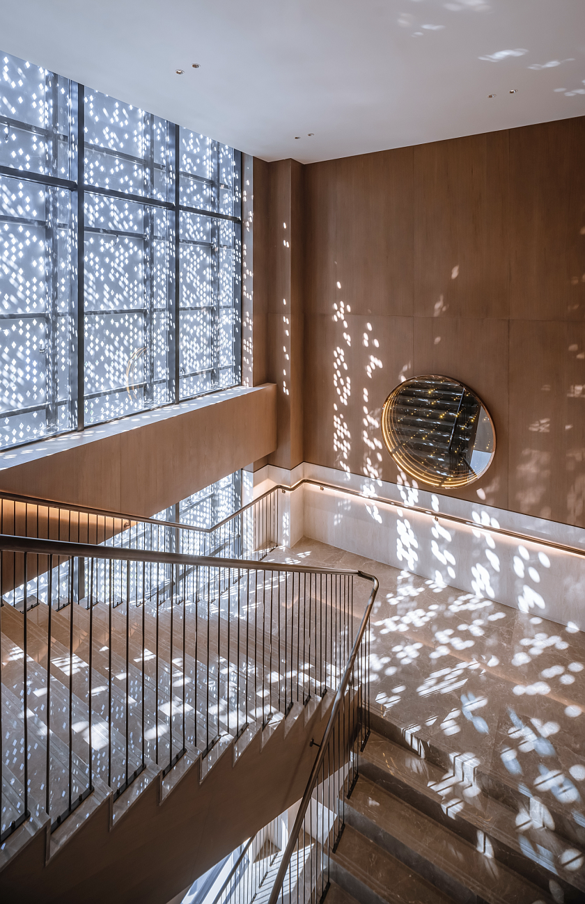 面向主干道的裸眼3D视频、建筑层间的连续光带、印花玻璃的色彩变化、天花吊顶的星光散布,这是一次人与科技、人与建筑、人与人之间互动对话的光感之旅,自然星空的诗意浪漫与探寻未来的奇幻未知将引领到达此处的人们感知城市的历史与未来。