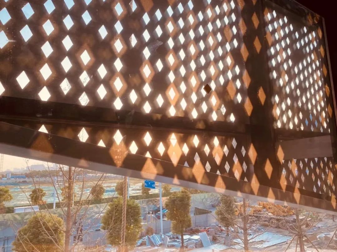 双表皮效果针对菱形穿孔板尺寸与孔数进行细节设计,运用参数化软件随机组合且通过多次1:1对比实验,项目最终选用60*36穿孔尺寸,孔板结合高透玻璃,形成丰富的空间光感效果——白天在随着自然光线的强弱变化,由外向内干涉内部空间的光感,激发建筑空间的通透和自然感;夜晚内部空间的灯光由内而外穿透孔板散发,在建筑外立面形成星光点点,形成丰富的近人尺度图案渐变,同时呼应金陵星图的大盘理念。