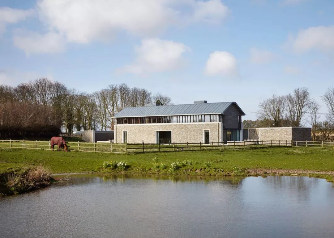本地的建筑材料传统与现代建筑理念在这里得到融合:外墙下半端覆盖着一层取材于当地采石场的石头。向外是巨大的燧石堡垒般的墙壁。内里,整面的玻璃幕墙为室内带来充裕的阳光。两个半封闭式庭院位于房子的东端和西端。