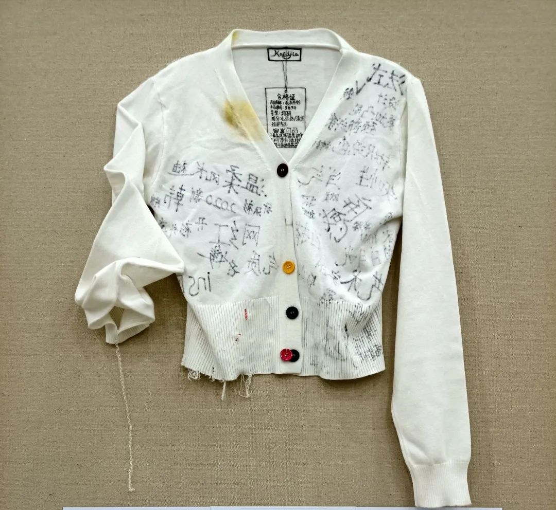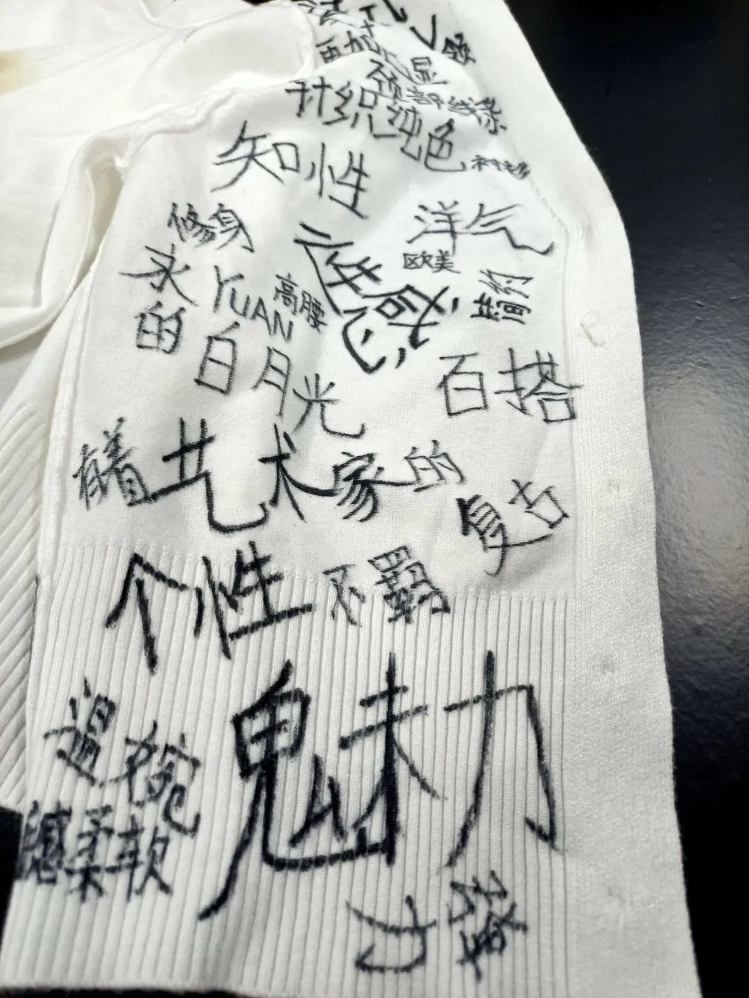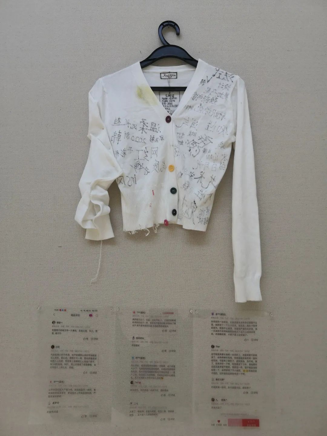 作品说明:网购在给人们带来便利的同时,也存在着虚拟和现实所不可避免的差异。物品的评论成为人们定义某件物品的标准,好评和差评受个体不确定性、随机性的影响。差评成为物品销量的致命性因素。我从网上购买了一件自己喜欢的衣服,将这件衣服的所有的差评都表现在这一件上,以一种幽默有趣的方式反应一种现实性问题。