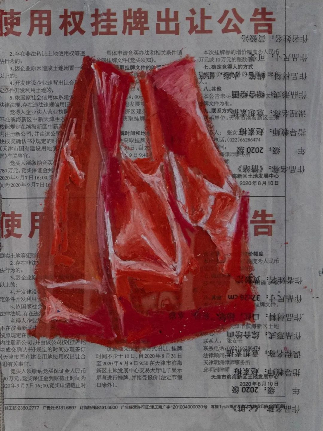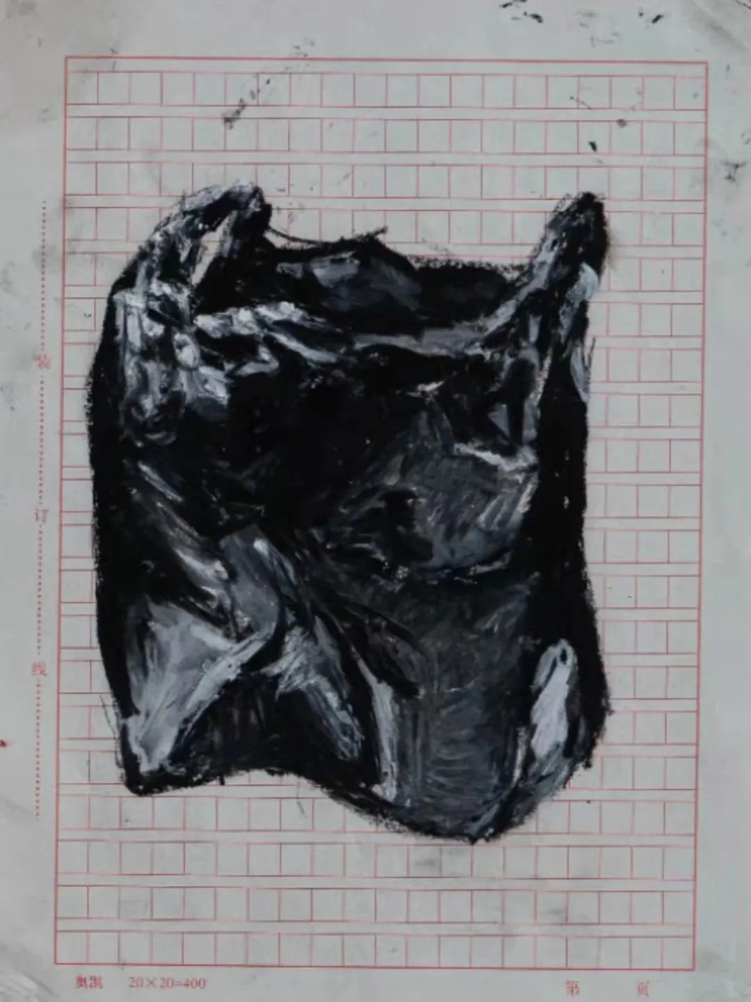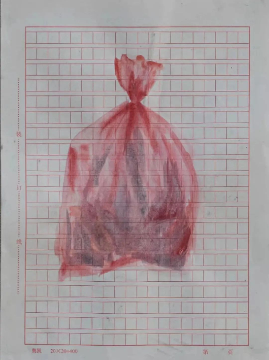 作品说明:高中时期与垃圾桶相伴,见识了各种各样的垃圾袋,我做了一个组合,把各种形态的垃圾袋画在红格子纸上面,并且用报纸与硫酸纸的叠加,形成了奇妙的效果。
