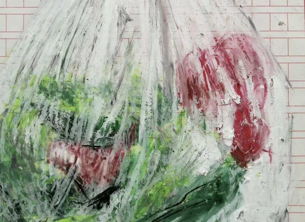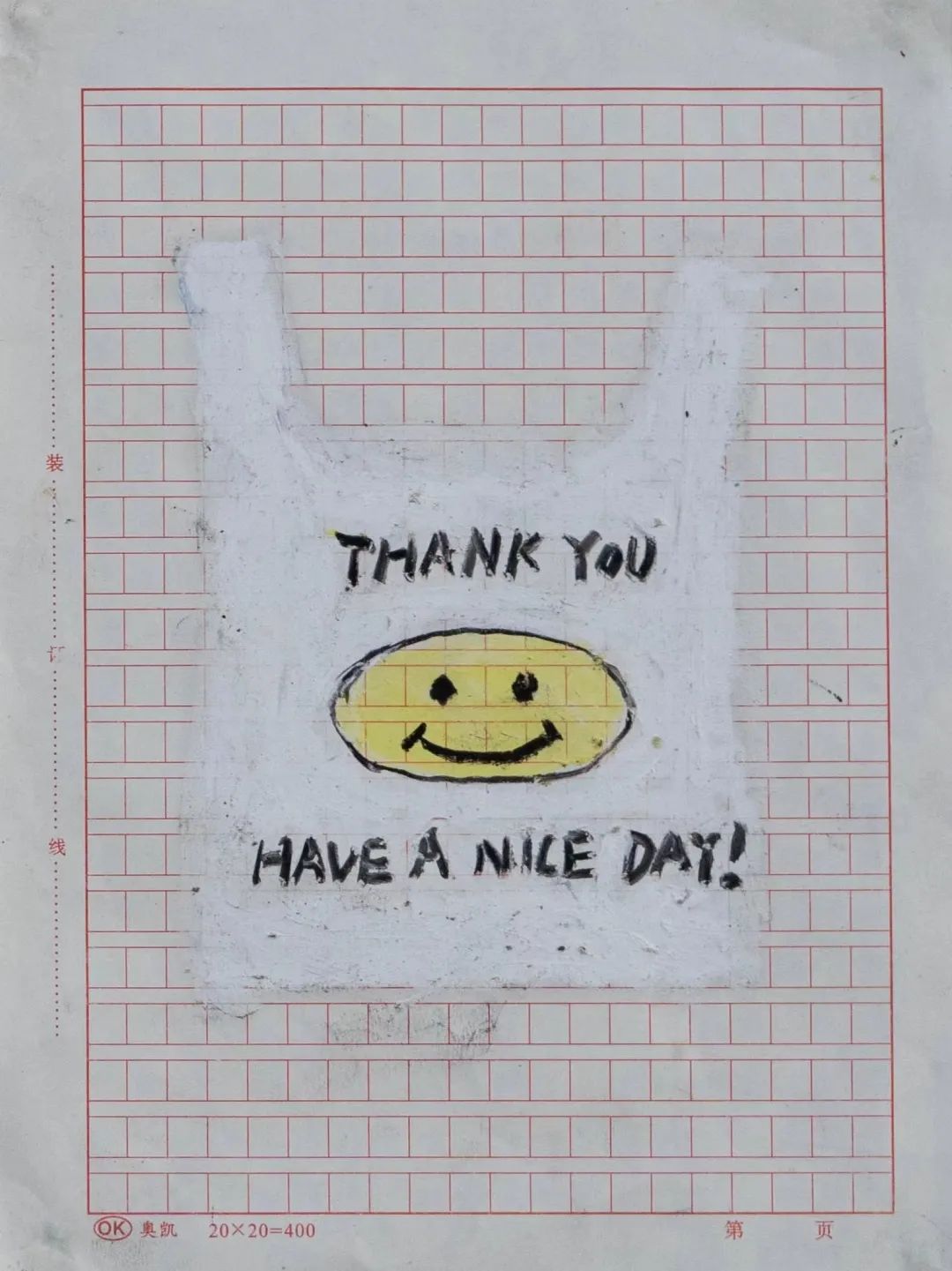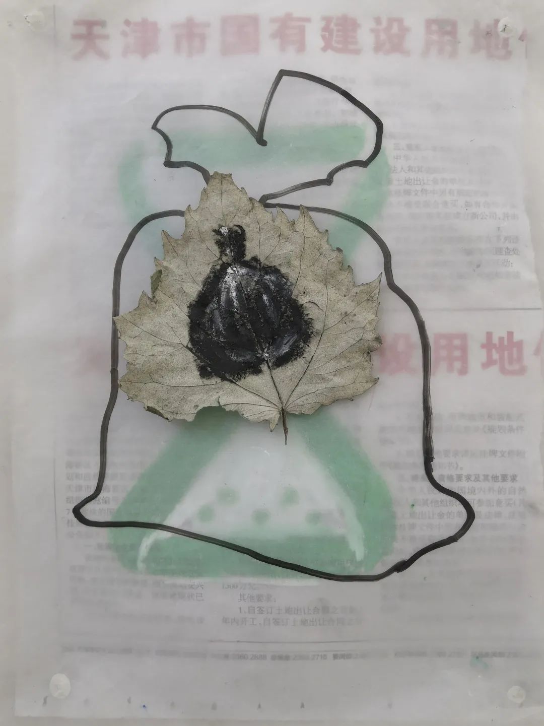 作品说明:高中时期与垃圾桶相伴,见识了各种各样的垃圾袋,我做了一个组合,把各种形态的垃圾袋画在红格子纸上面,并且用报纸与硫酸纸的叠加,形成了奇妙的效果。