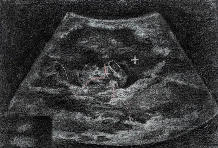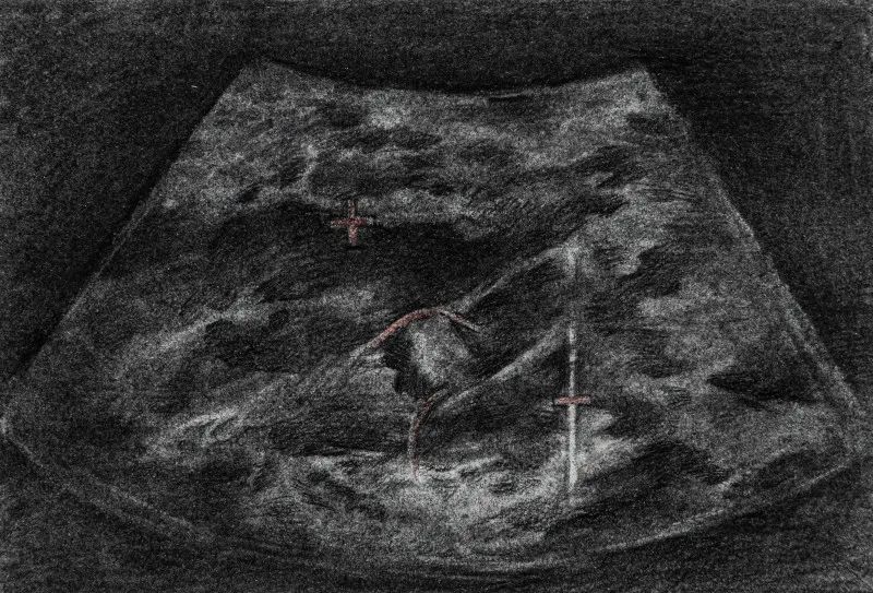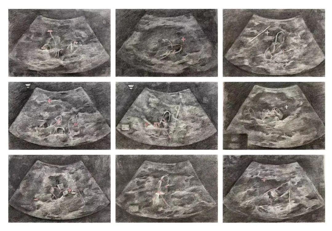 作品说明:外婆家生锈的铁锁让我深受启发,我见证了铁锁刚买回来挂上到生锈被遗忘的过程。我把生锈的这一个过程化为人类怀孕分娩的一个过程,每一张都代表子宫一个月和铁锁的不同阶段。