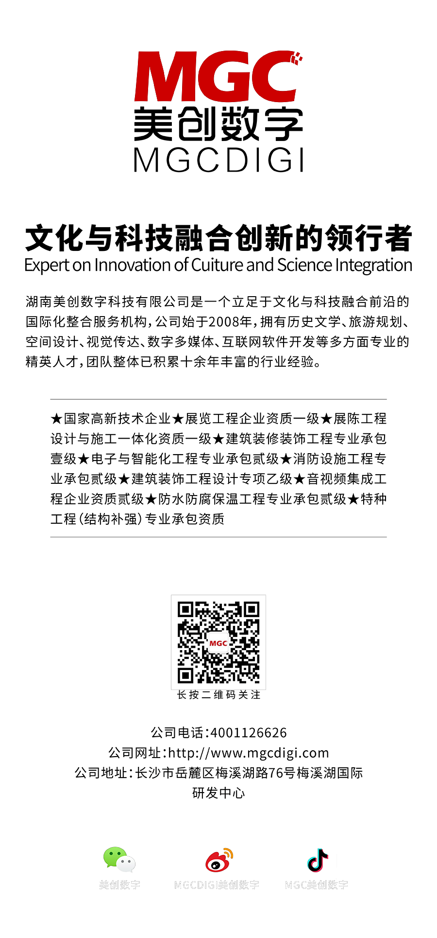 MGC美创,全称湖南美创数字科技有限公司,是一个立足于文化与科技融合前沿的国际化整合服务机构,公司始于2008年,拥有历史文学、旅游规划、空间设计、视觉传达、数字多媒体、互联网软件开发等多方面专业的精英人才,团队整体已积累十余年丰富的行业经验。
