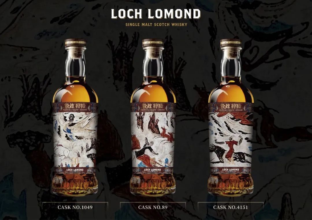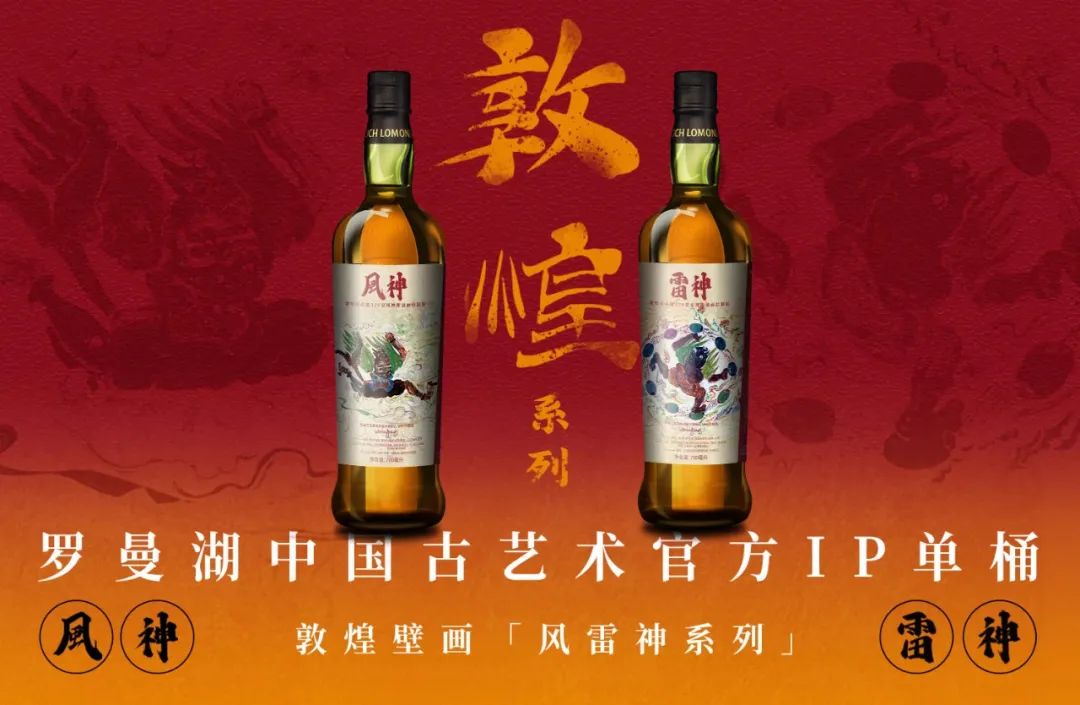 又如,罗曼湖也曾数度与敦煌壁画艺术结缘。早前以“风神”“雷神”“飞天”等神话人物为主题形象绘制酒标,推出单桶威士忌。之后又推出敦煌《狩猎图》系列,取法西魏249窟窟顶北披狩猎图:此窟窟顶四披壁画佛道糅杂、内容丰富,既有两教人物、天宫,又有古代建筑及人间生活各场景,其中,《狩猎图》最具精彩刺激的动势,画面中一人骑马回头射杀白虎,另一人骑马追逐前面的三头野鹿,山林间山峦连绵,野牛野猪悠游其中,人物气韵生动,弯弓搭箭时镇静自信,展现出古代河西走廊人民喜爱狩猎的生活习俗。