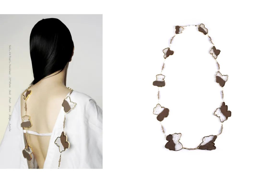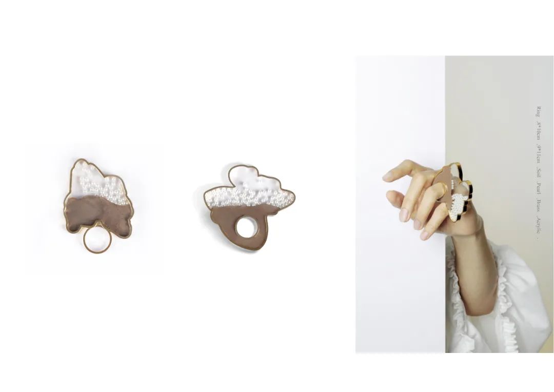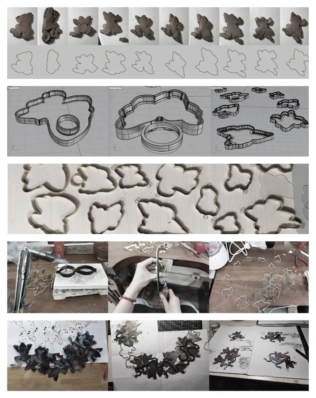 在创作过程中,我仿照女娲抟土造人,用捏泥蛙「造神」,我用泥土捏了许多泥蛙,然后像社会规训女性一般对它们进行摔打,将变形后泥蛙的图案记录下来,作为设计元素进行再加工,铸造成金属。通过首饰的方式阐述女性与蛙的意象关联,而我创造首饰的过程即成为“造神”的过程。当社会想把女性塑造成神一般全能的存在时,我以首饰的方式向女性提问:你愿意成为孕育他人、成就他人的泥土?还是愿意成为自带光芒的珍珠?