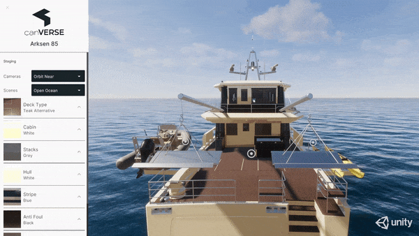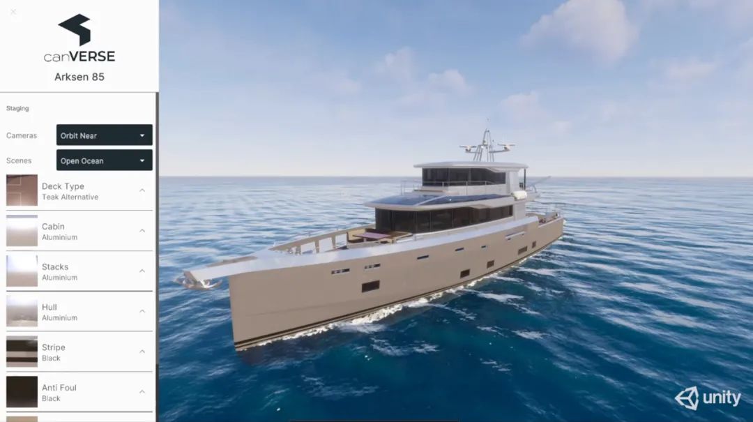 canVERSE 使用 Unity Forma 建立了一种流线化流程,根据 Arksen 提供的 CAD 数据制作了一个可完全互动的实时 3D 船只配置器。