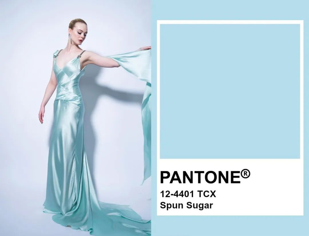 左:演员艾丽·范宁身着Gucci出席2021年金球奖;右:Pantone发布的色卡Spun Sugar