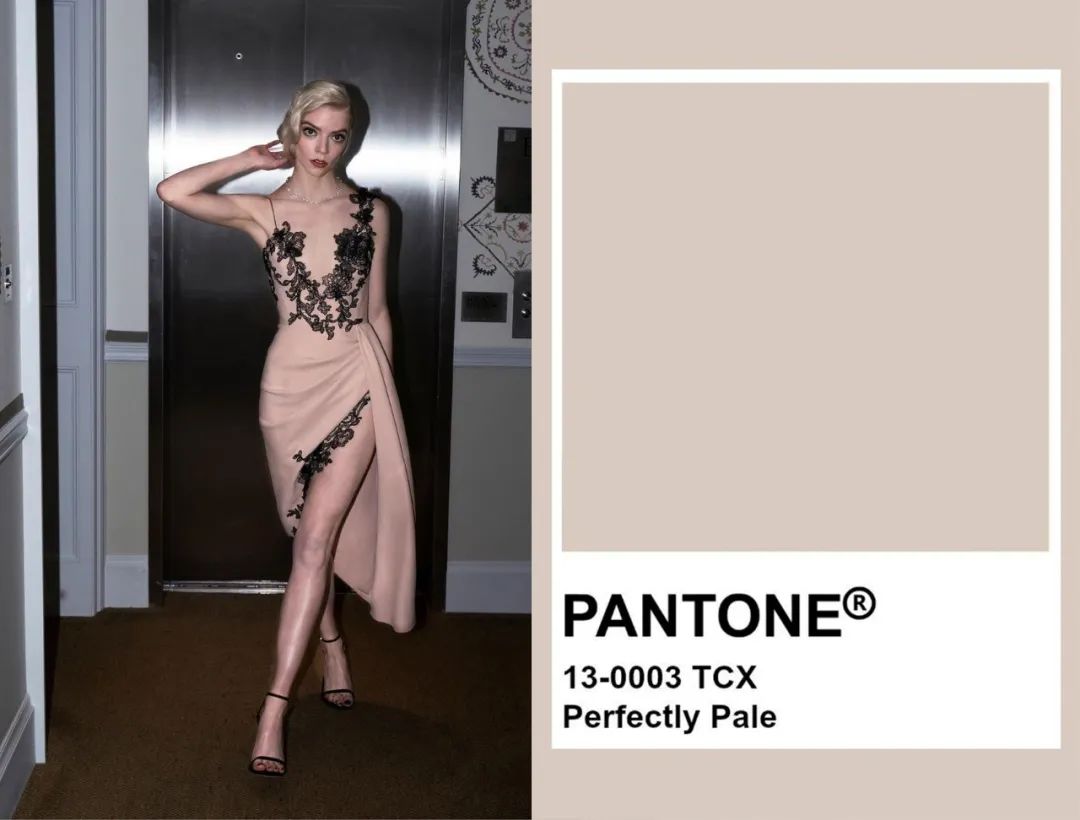 左:演员安雅·泰勒-乔伊身着Vera Wang出席2021年美国演员工会奖;右:Pantone发布的色卡Perfectly Pale