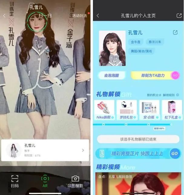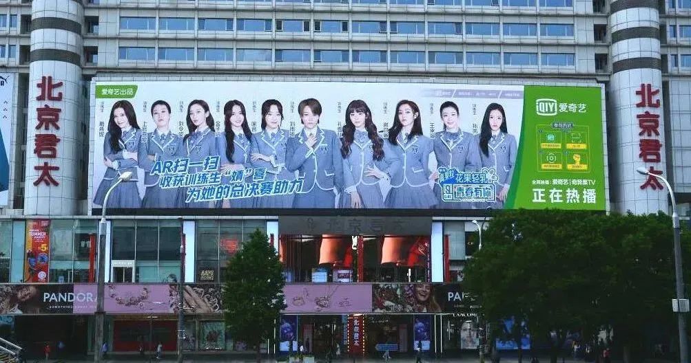 例如,《青春有你2》20强相关的全国首支强交互AR广告。行人打开爱奇艺APP用AR扫一扫LED屏幕,即可识别出训练生的信息,并直接跳转到助力页面,为喜欢的训练生打call。微博上#青你2训练生AR助力#的话题阅读量也一路冲破700万。