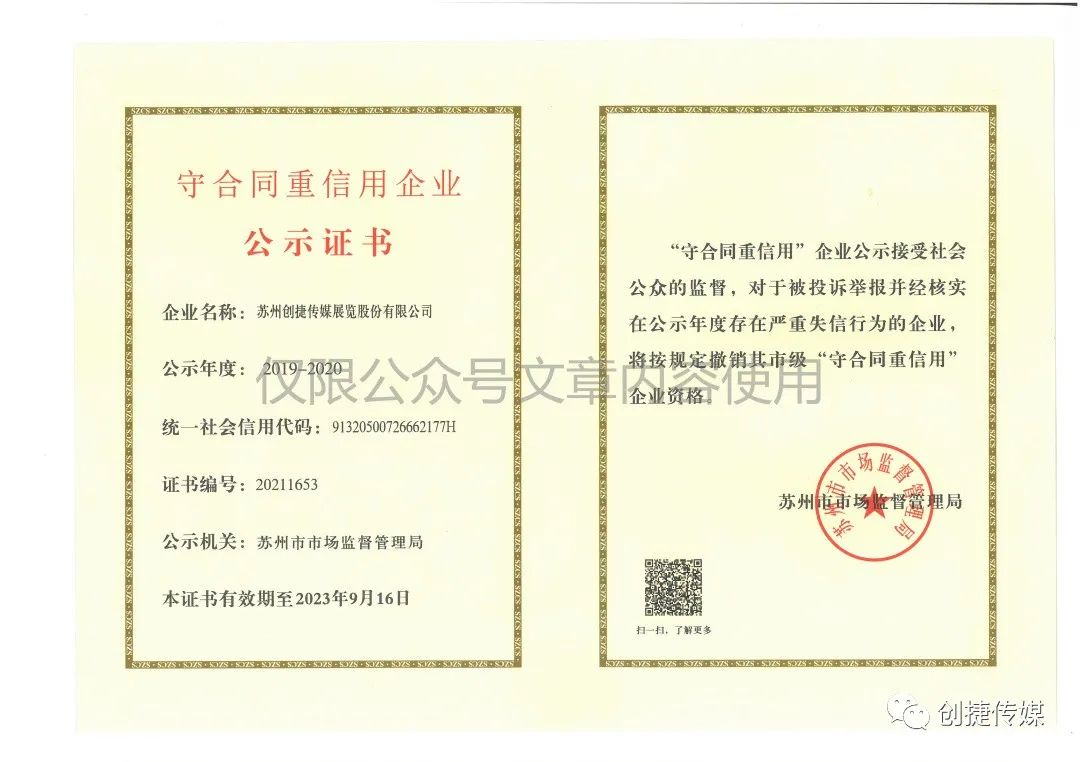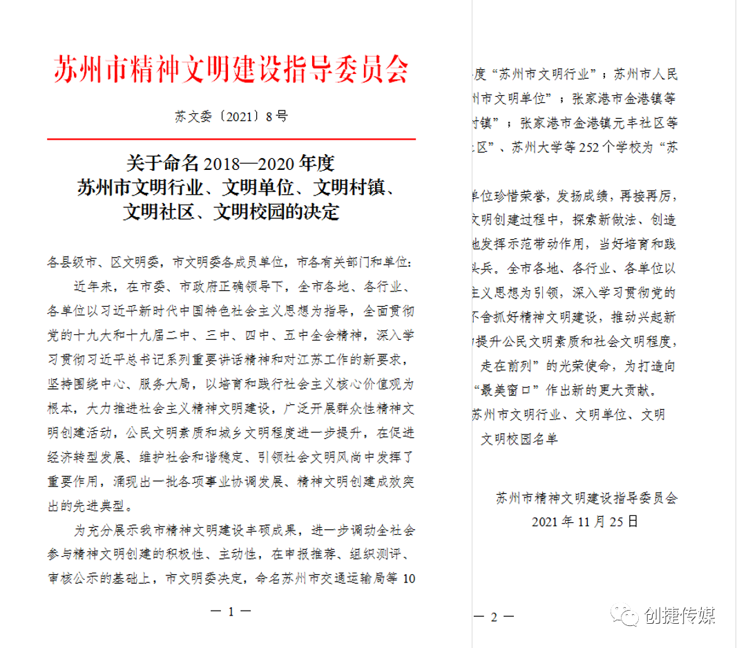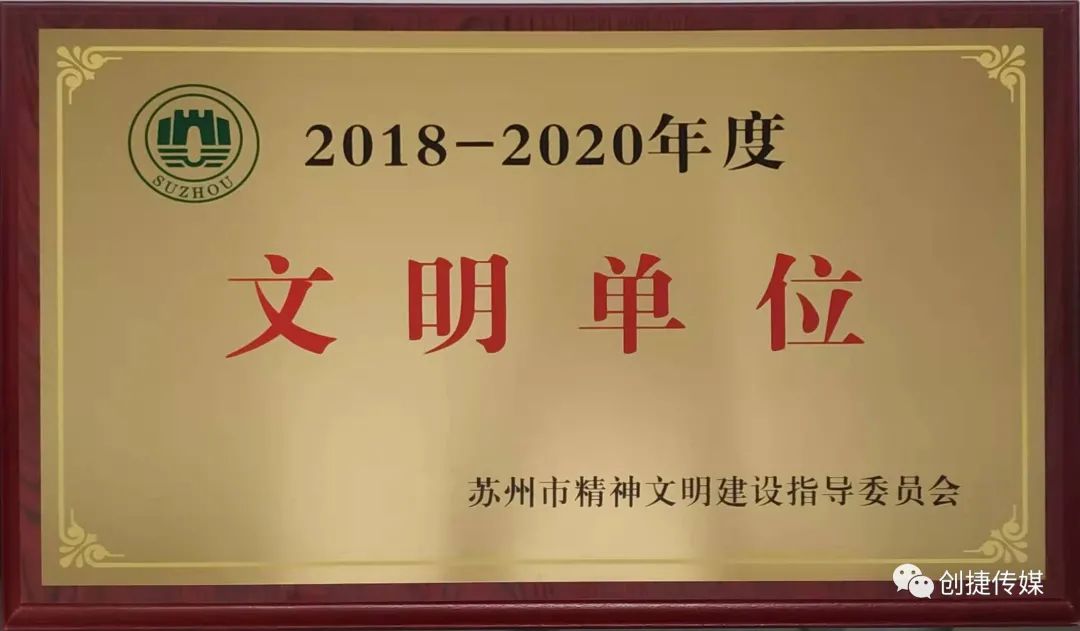 2021年年末,在申报推荐、组织测评和审核公示的基础上,苏州市精神文明建设指导委员决定,命名创捷传媒为2018—2020年度“苏州市文明单位”。