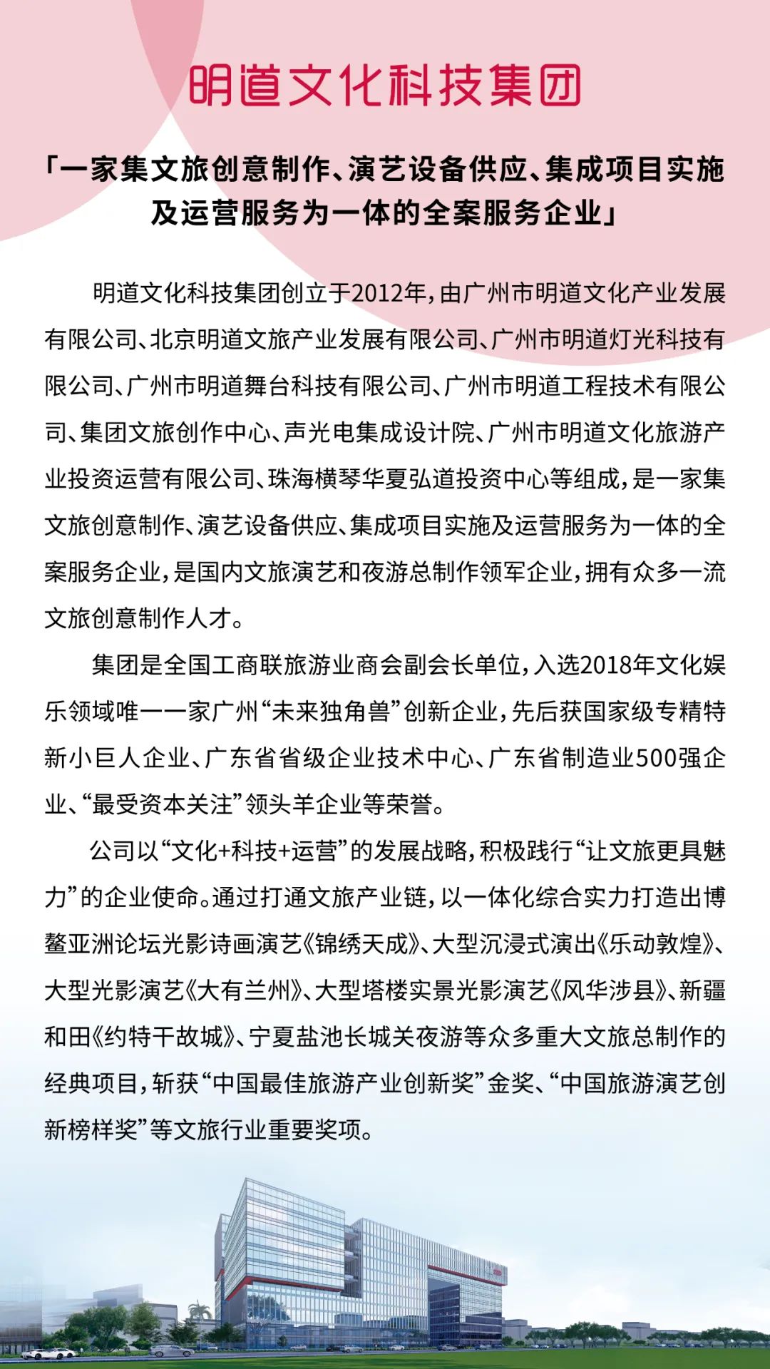 集团旗下的明道灯光科技经过近10年的发展,目前已成为中国自主品牌专业演艺灯光行业领军品牌,拥有光学、散热、结构等数百位专业科技人才,自主创新的文化产品已取得了丰硕的成果,拥有国内外发明专利5项,实用新型专利72项,外观设计专利21项,软件著作权11项。产品被广泛应用于建国七十周年联欢活动、G20 杭州峰会文艺演出、上合组织青岛峰会、央视春晚、湖南卫视《我是歌手》、国家大剧院、俄罗斯尼古林大马戏、美国洛杉矶环球剧院等国内外众多重大项目。