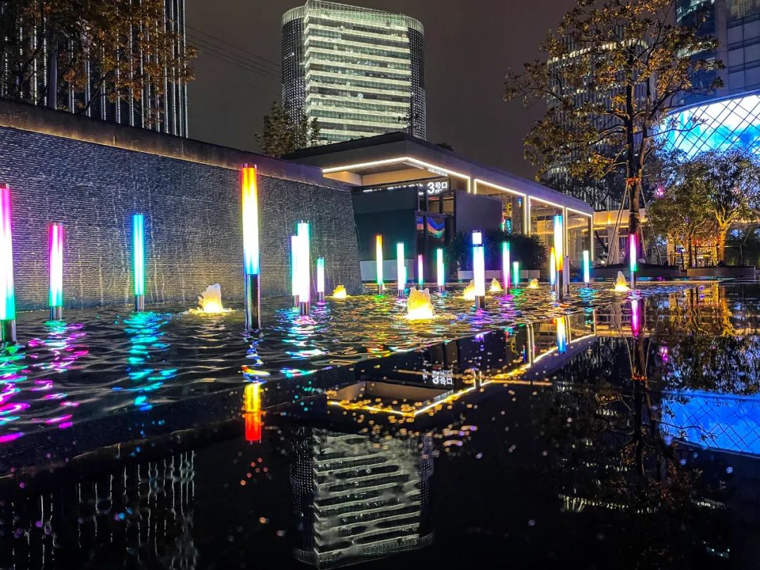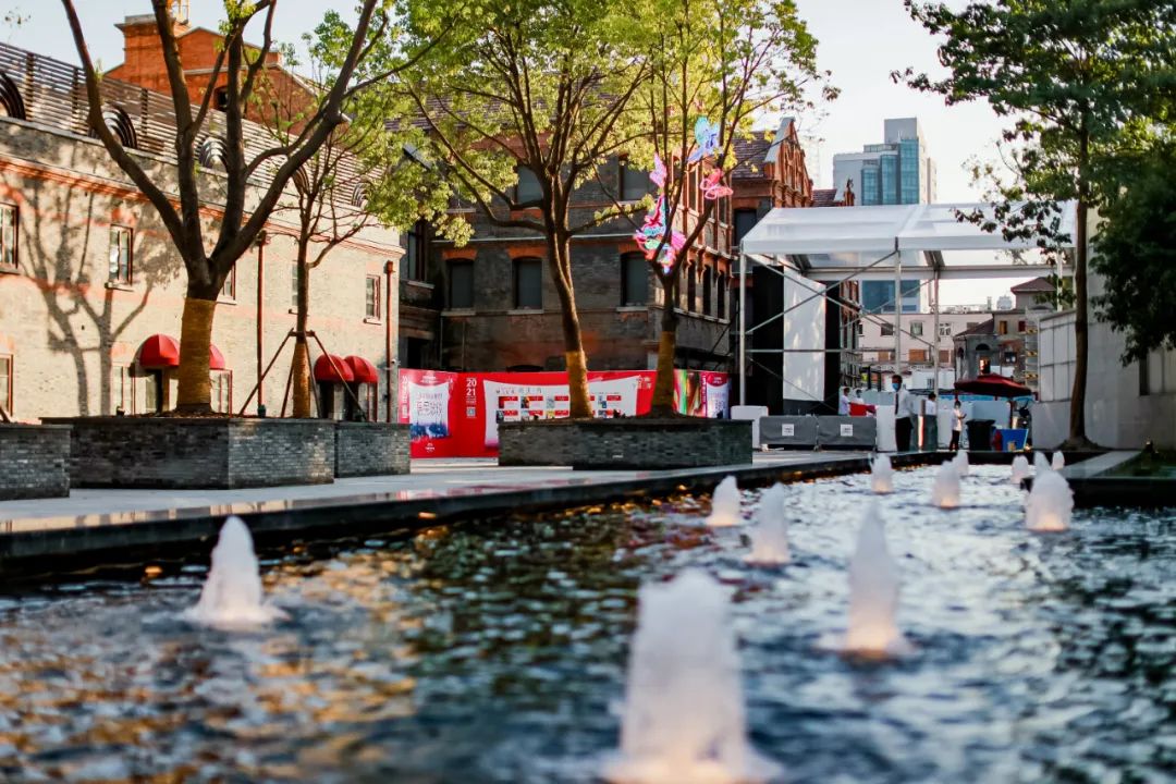 宫岛达男的这件作品在2020年上海民生现代美术馆的个展“如来”中就有亮相,空旷的展厅,《数字瀑布》被陈列在静谧的没有涟漪的水池,水中倒影一同构成作品的空间语境。而本次被置于城市公共空间——在一个车水马龙的十字路口,以城市为背景,映射出了不一样的风景。一方面是在这个赋予时间性意义的仪式感中被增添了别样的交互,另一方面,它串联起街区环境,并与城市变迁中各个时代的建筑共同演绎时间的流逝。