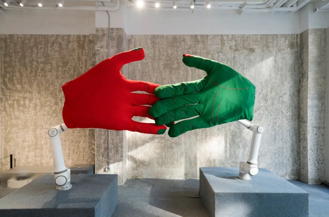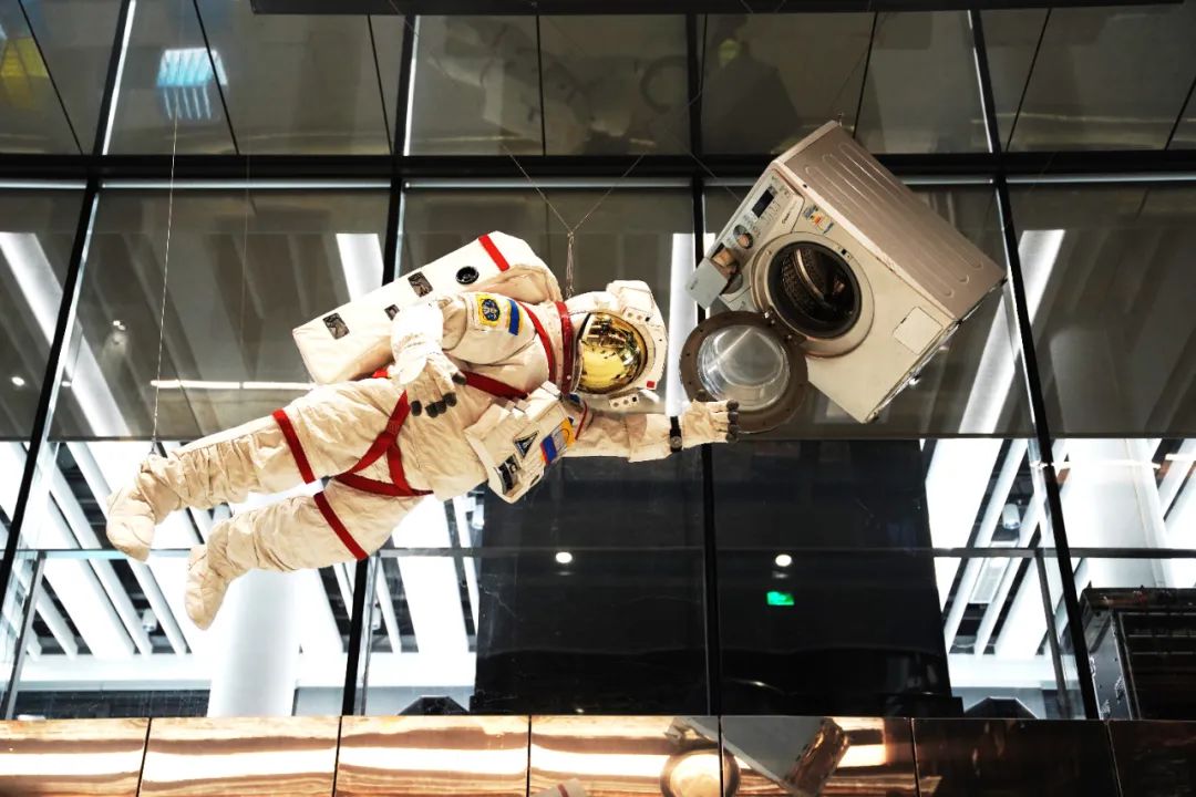 最后的一个篇章“折叠未来”邀请陈楸帆创作了一部小小说《未来奇遇》,讲述自己在夜晚带着醉意进入这个历史与未来交叠的街区,在无尽的时空中遇见这场展览。这篇小说本身是一件艺术作品,同时也是对作品的一种个人诠释。而真实伫立于街区之中的艺术作品串起小说的叙述,亦将当下空间锚定在小说中的时间线,让观者真正的在物理空间走进虚拟。“宇航员指了指,滚筒洗衣机门打开了,里面幻化万千,流光溢彩,像是藏着一整个宇宙。”