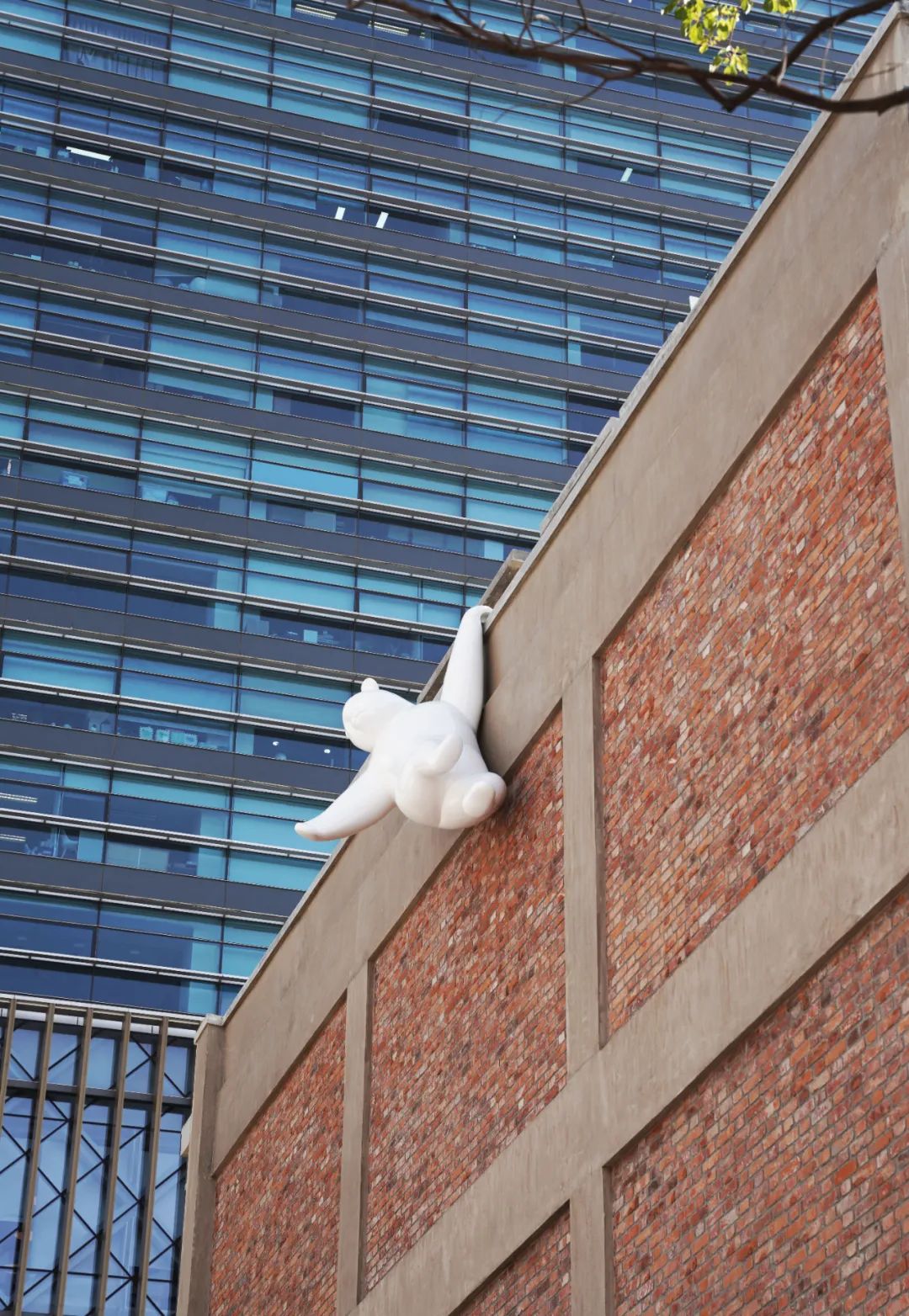 从10号线四川北路站3号口出来,一头玫红色的大熊贴着玻璃,好奇的望向来往人流。“城市奇遇空间艺术展”从此开始偶遇,坐在街角的熊猫、悬在老房子屋顶的熊、喷水的红色大象、朱利安·奥培带着《耳机》行走的人迷失在里弄…… 在艺术展的第一篇章“城市森林”中,策展人试图将自然生态和城市环境相结合,以艺术的诗意想象力,将都市舞台与灵性的大自然嫁接,以童真打破日常生活的节奏,让匆忙的脚步驻足片刻,偶遇一种新的生命体验。