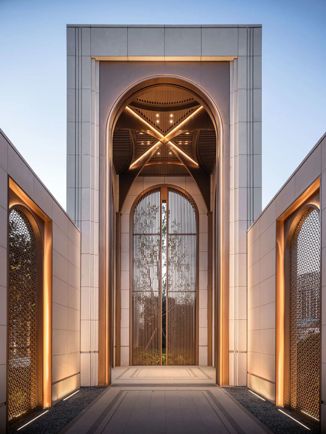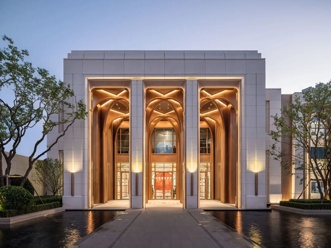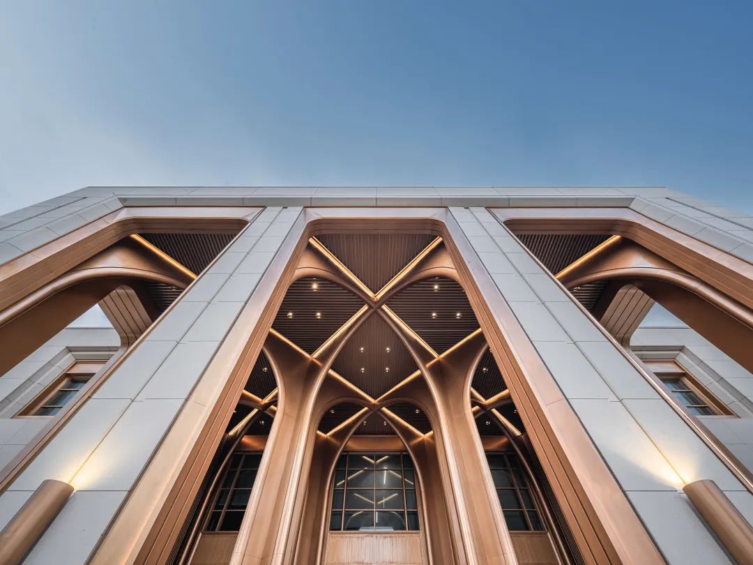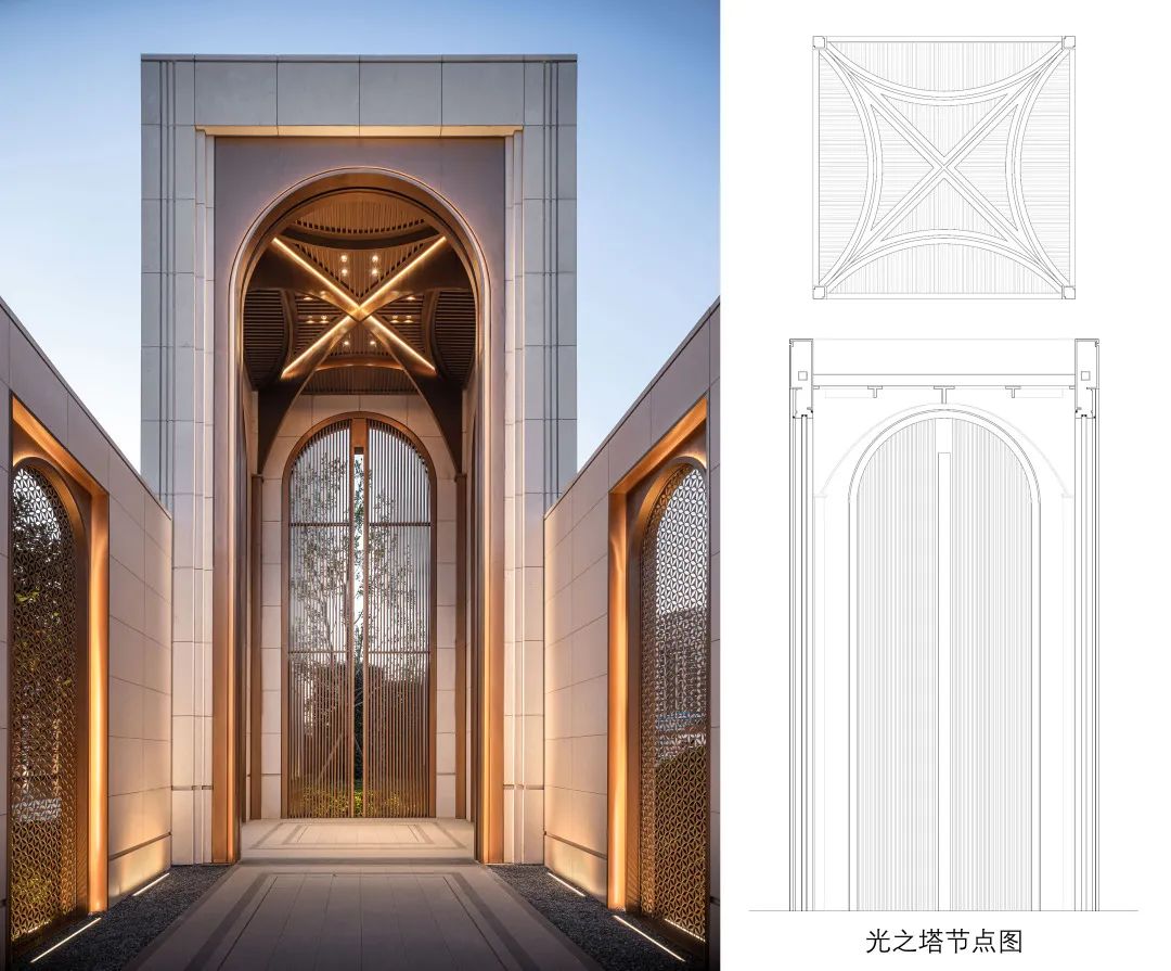 置身于“光之塔”下,光线柔和纯净,气势恢宏的建筑主入口,遵循古典美学比例,六个精致挺拔的金属十字“光之拱廊”,都在演绎着丰富的光影变化。