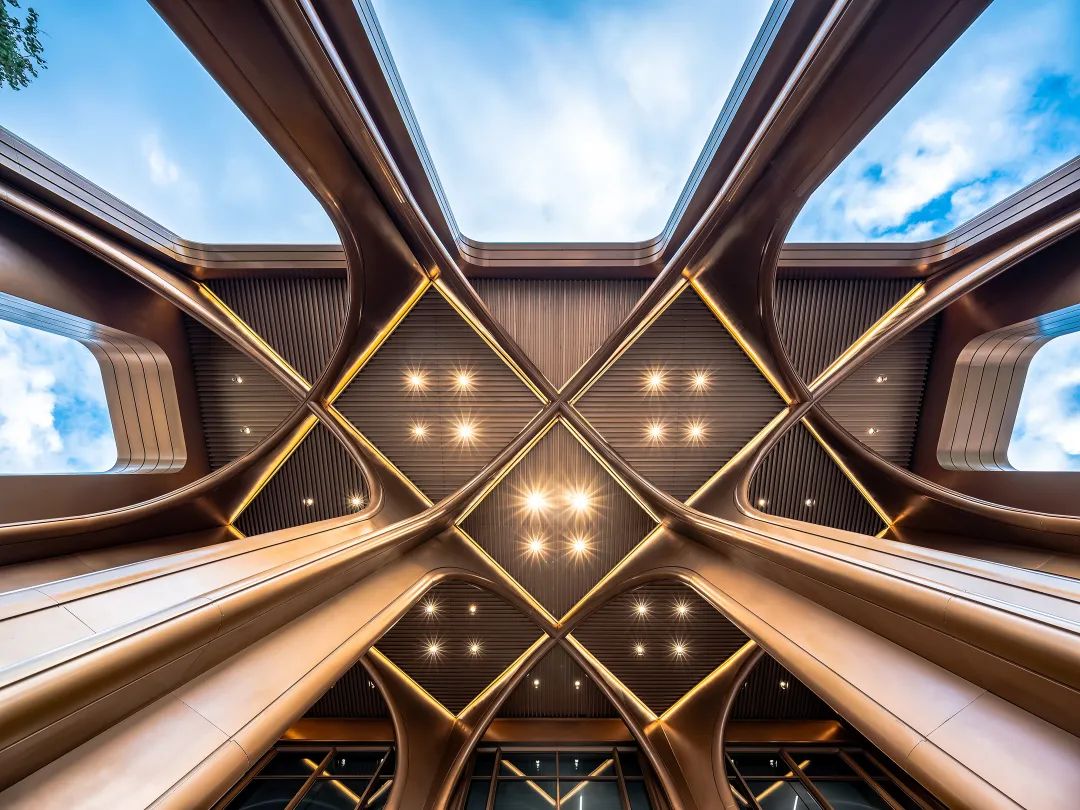 “光之礼堂”作为建筑整体的序章,拉开“逐光”之旅的帷幕。镂空的格栅金属顶,线型灯具交织在一起切割成斑驳光影,照亮空间。