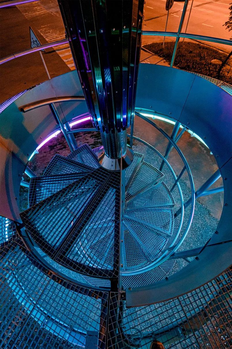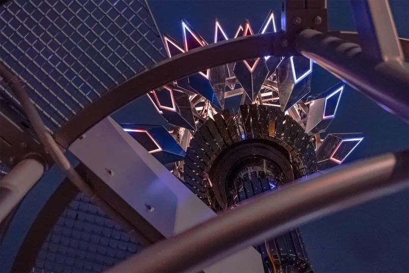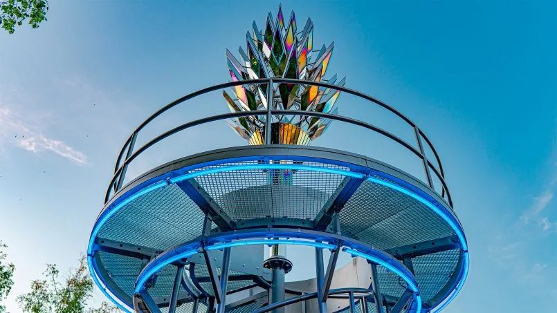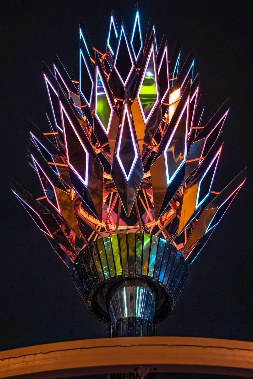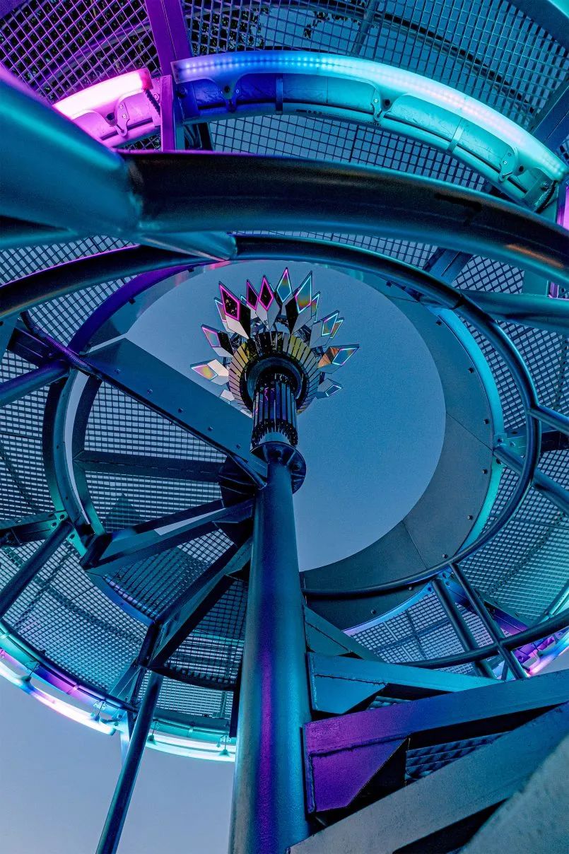 许多由抛光不锈钢制成的体积镜模块带有集成的 LED 照明,形成了装置的主体,使物体在白天和黑暗中都能有效地与环境互动。公共艺术装置的观景台还配备了环形灯元素。观景台和装置的光元素组合成一个单一的光动力系统,将太阳活动数据转换为光模式。
